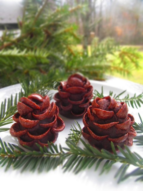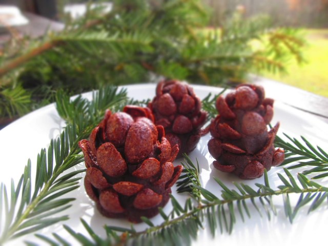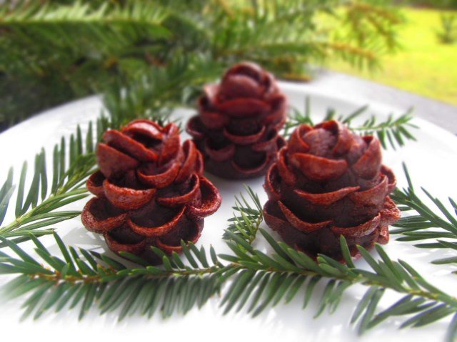 - Изчаках около половин час да стегне шоколадът и чак тогава аранжирах с три от най-красивите ми шишарки.