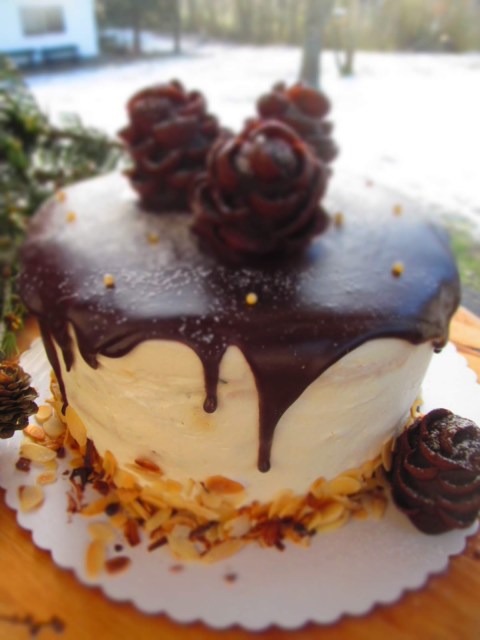 - С помощта на супена лъжица залях първо ръба на тортата, така че да се получат тези потичания от шоколад странично на тортата и чак после залях цялата торта.