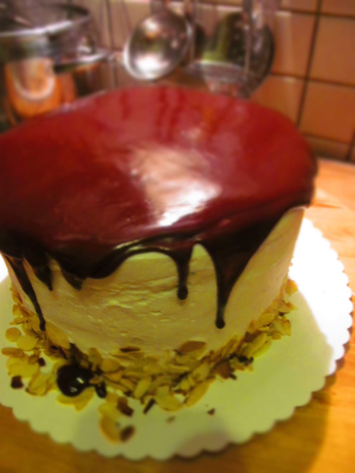 - С помощта на супена лъжица залях първо ръба на тортата, така че да се получат тези потичания от шоколад странично на тортата и чак после залях цялата торта.
