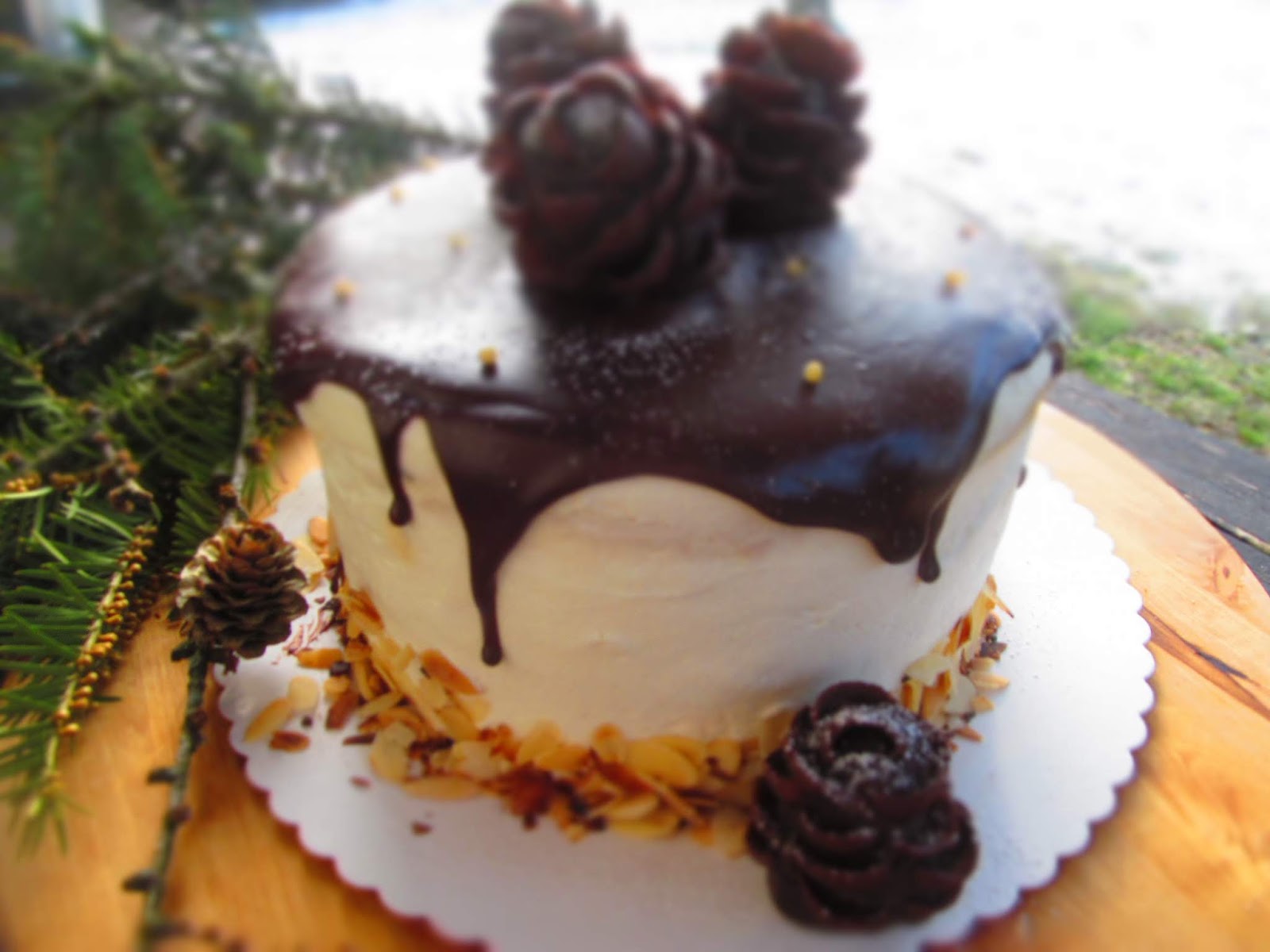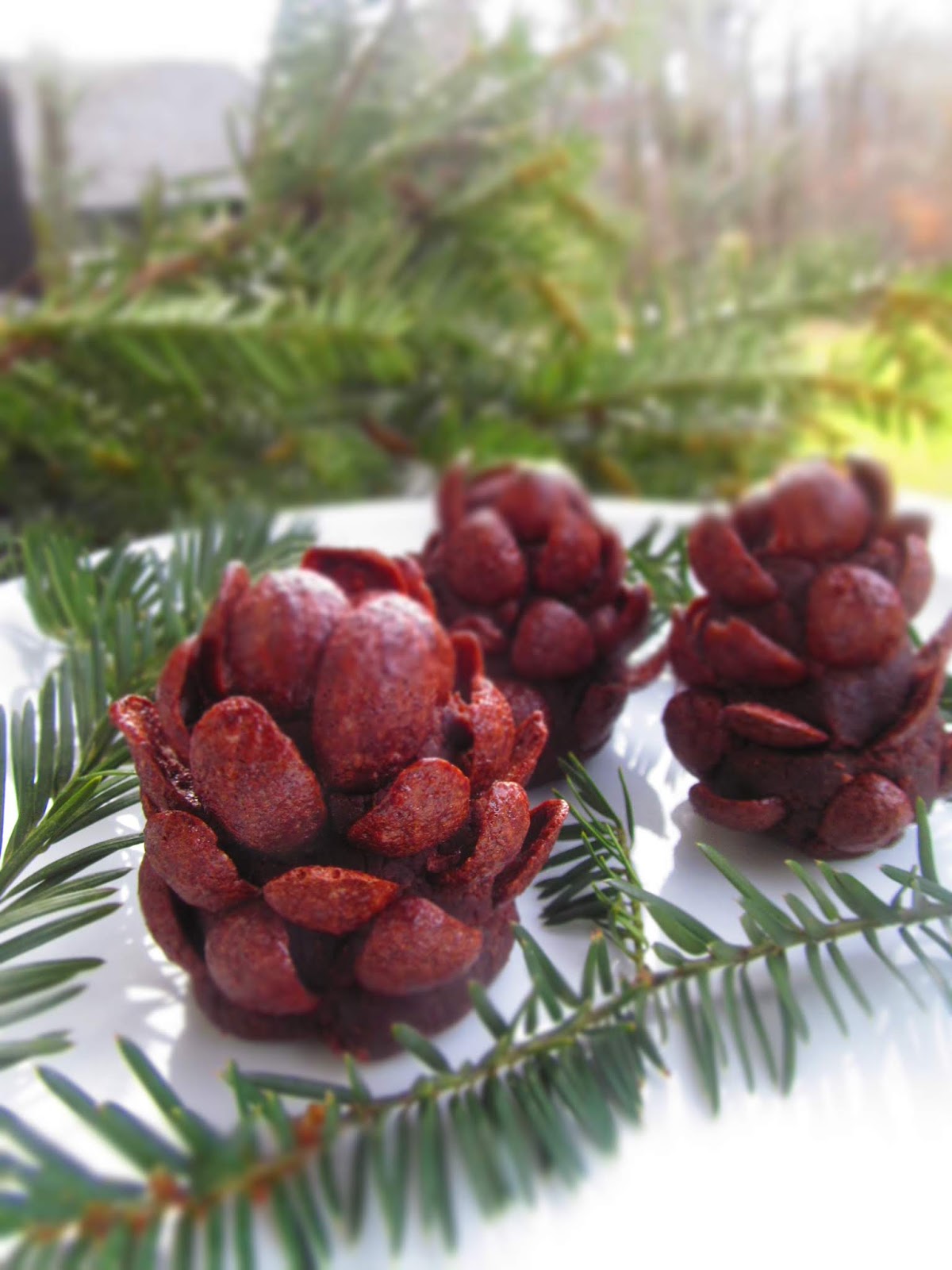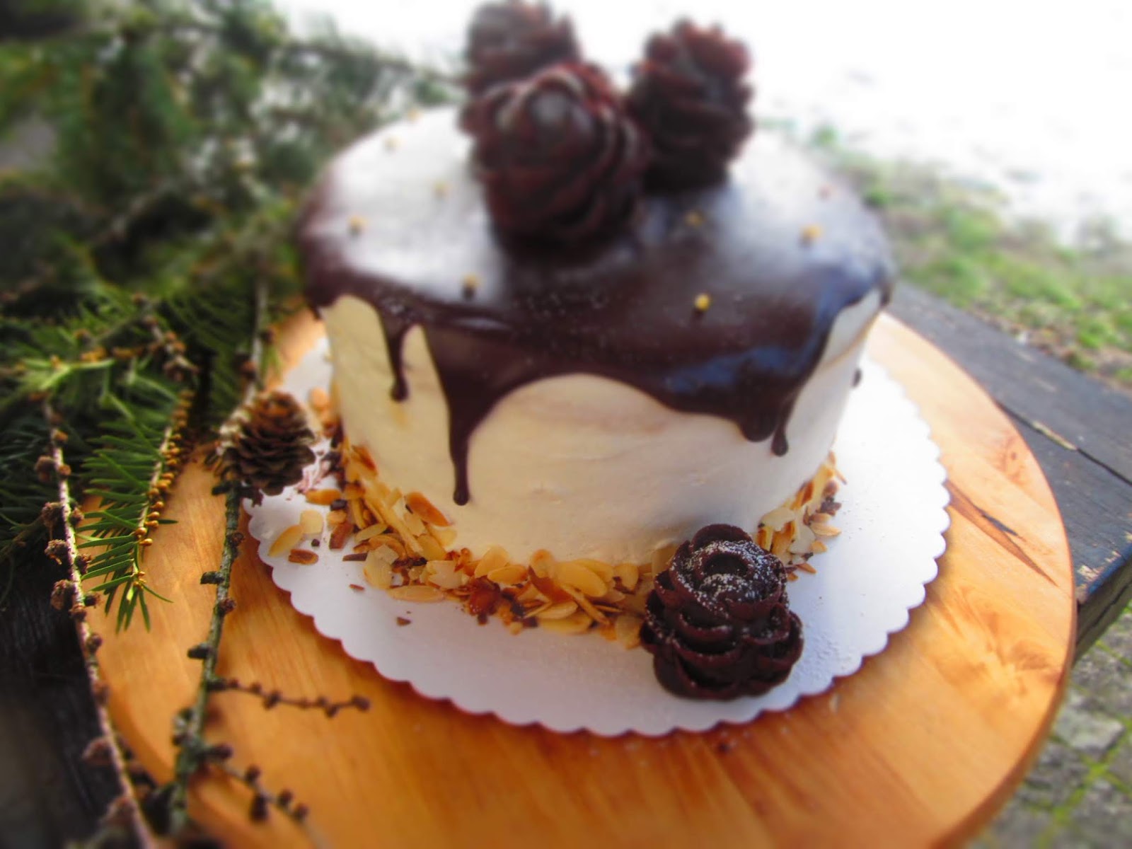 - Изчаках около половин час да стегне шоколадът и чак тогава аранжирах с три от най-красивите ми шишарки.