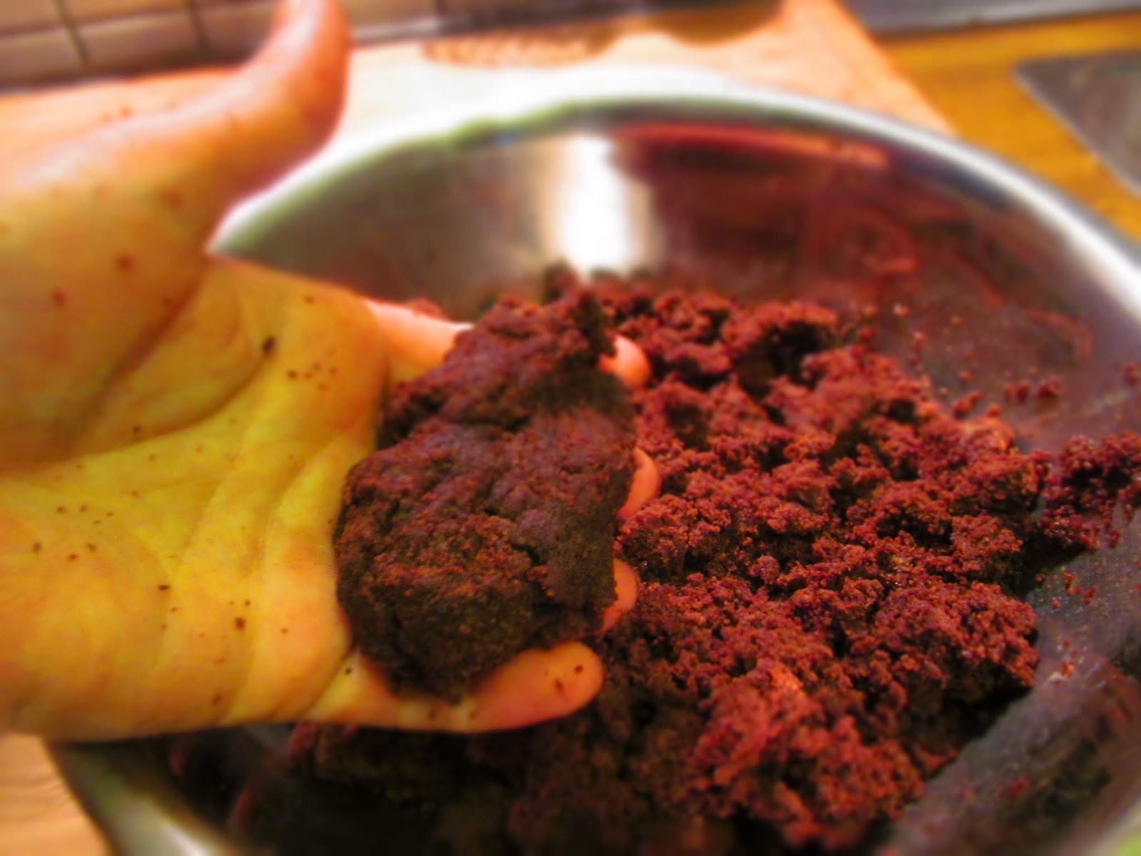 - Омесих с ръце. Ако Ви се струва сместа суха – добавете малко прясно мляко. Важното е като стиснете с ръце да остава на топка.