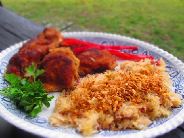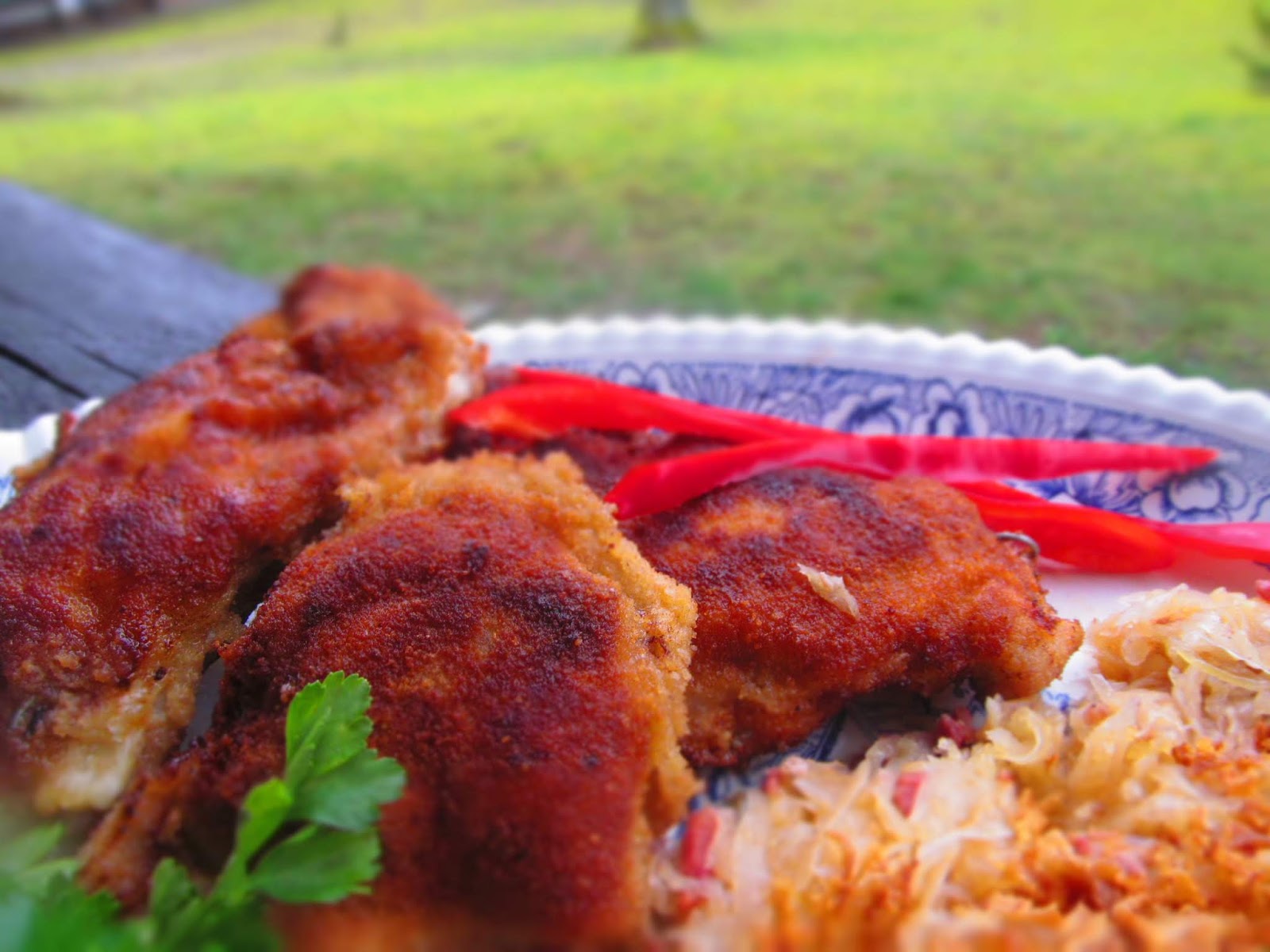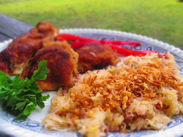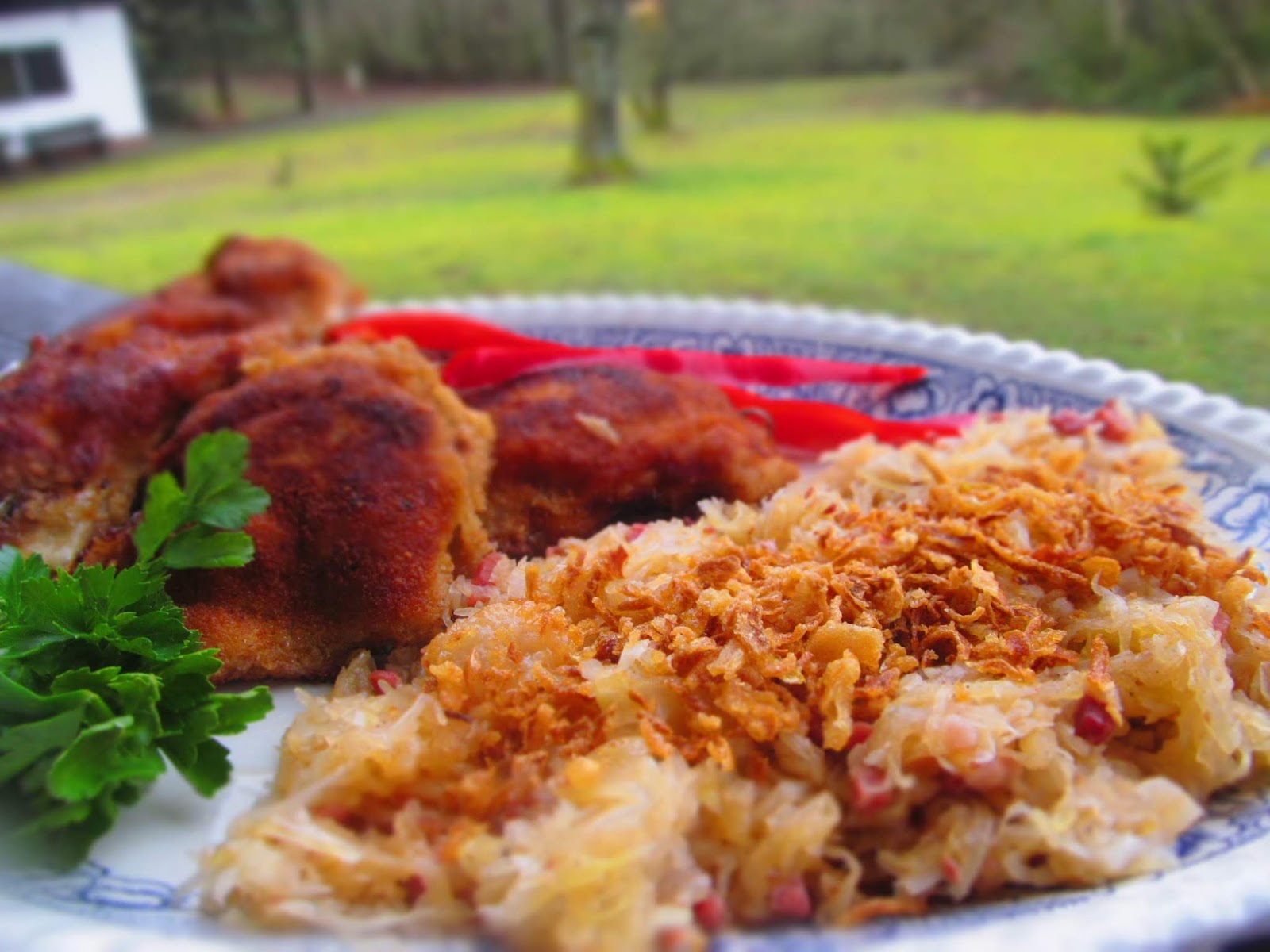 - За гарнитура използвах немско кисело зеле, но може да са варени картофи, браткартофел – рецепта тук, или просто помес – рецепта тук.