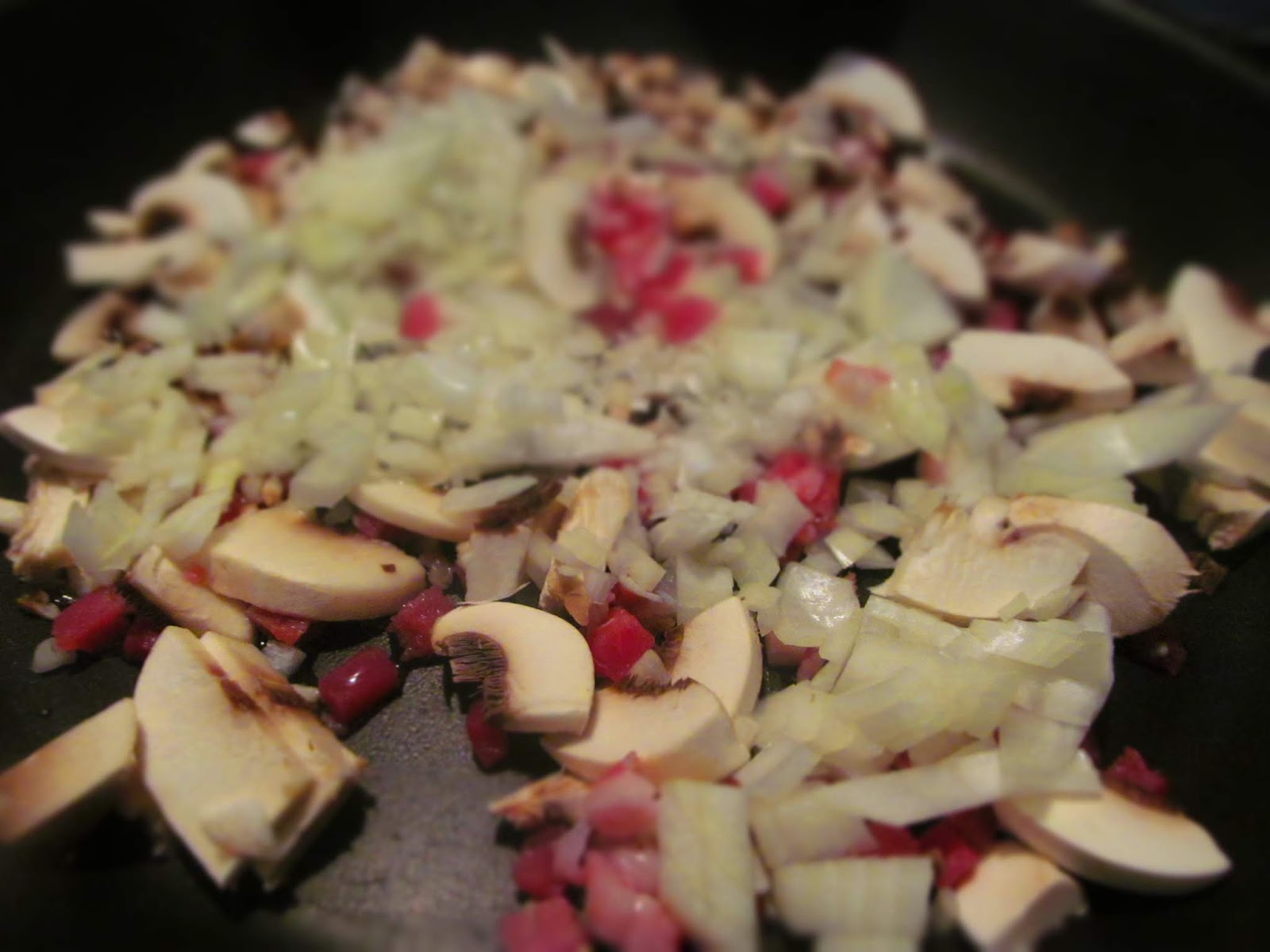 - За целта нарязвам лука на ситно, почистените гъби на ситно и бекончето. Добавям малко мазнина в тиганчето и леко задушавам до омекване на лука.