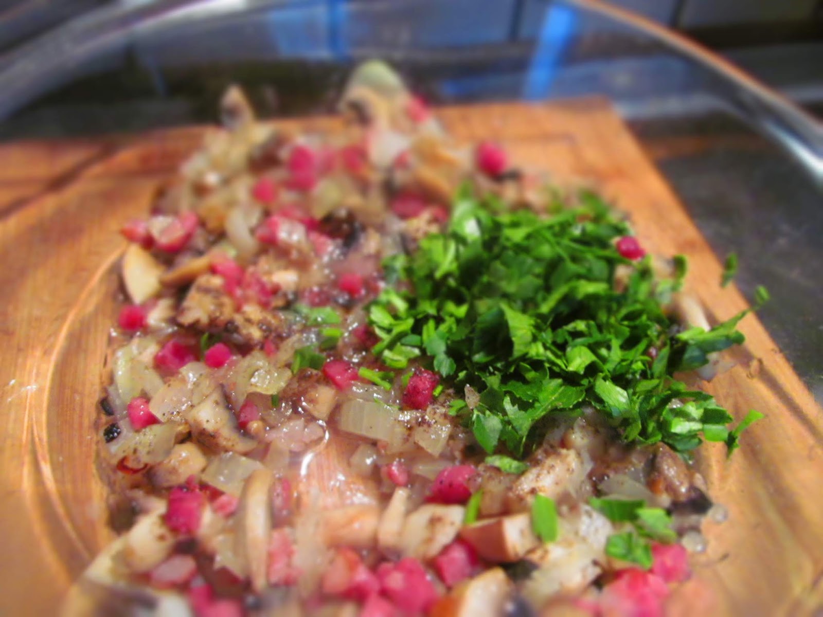 - Охлаждам плънката и добавям ситно нарязан магданоз.