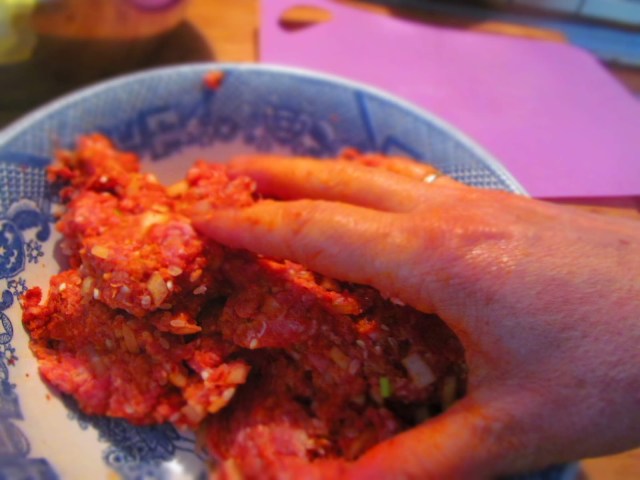 - В друга купа смесвам каймата с нарязания на ситни кубчета лук, ориза и подправките.