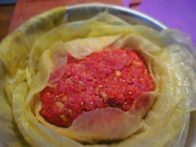 - Оформих на голяма топка, която сложих в средата на съблечената зелка.