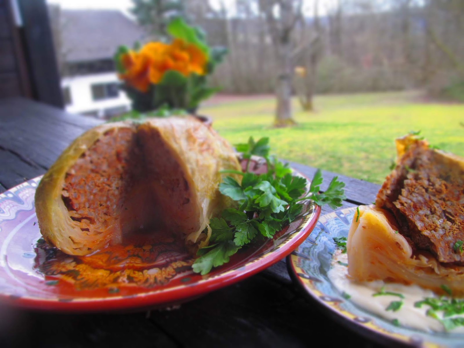 - Сосът от печенето на зелката много внимателно изсипвам в купичка. С него приготвям сос за сервиране на пълнената кисела зелка.