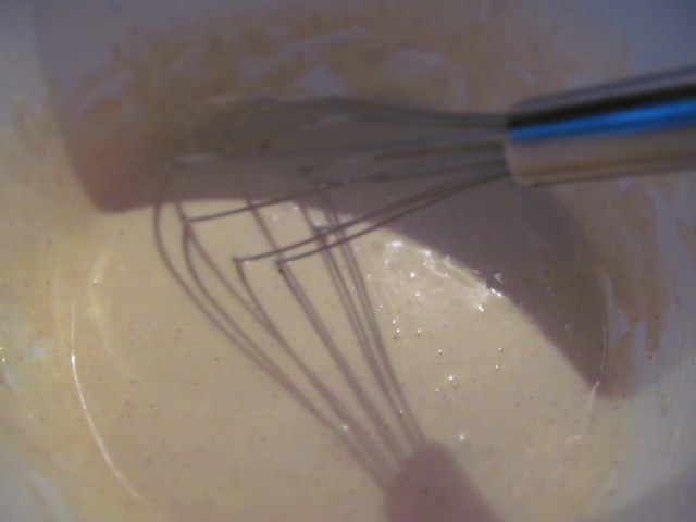 - Чуквам първото яйце, разбивам. После второто яйце и пак разбивам. Накрая третото яйце и получавам палачинкова смес.
