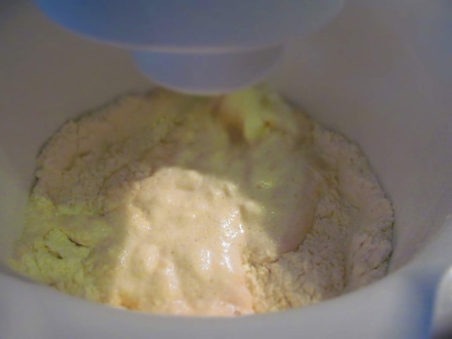 • През това време в две отделни купи смесих продуктите за всяко тесто. Брашно, сол, останалата захар, яйце и мекото масло.