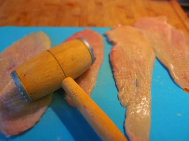 - Пилешките шницели измивам, подсушавам с домакинска хартия и начуквам.
