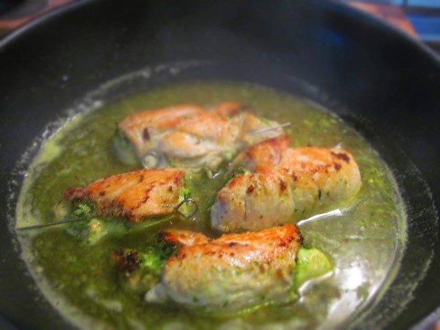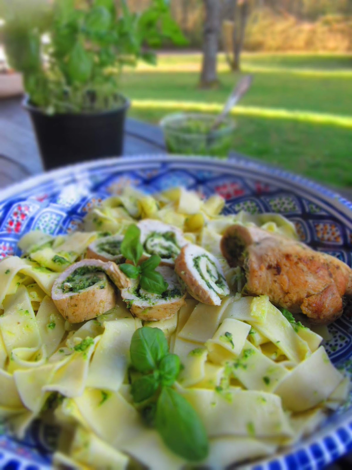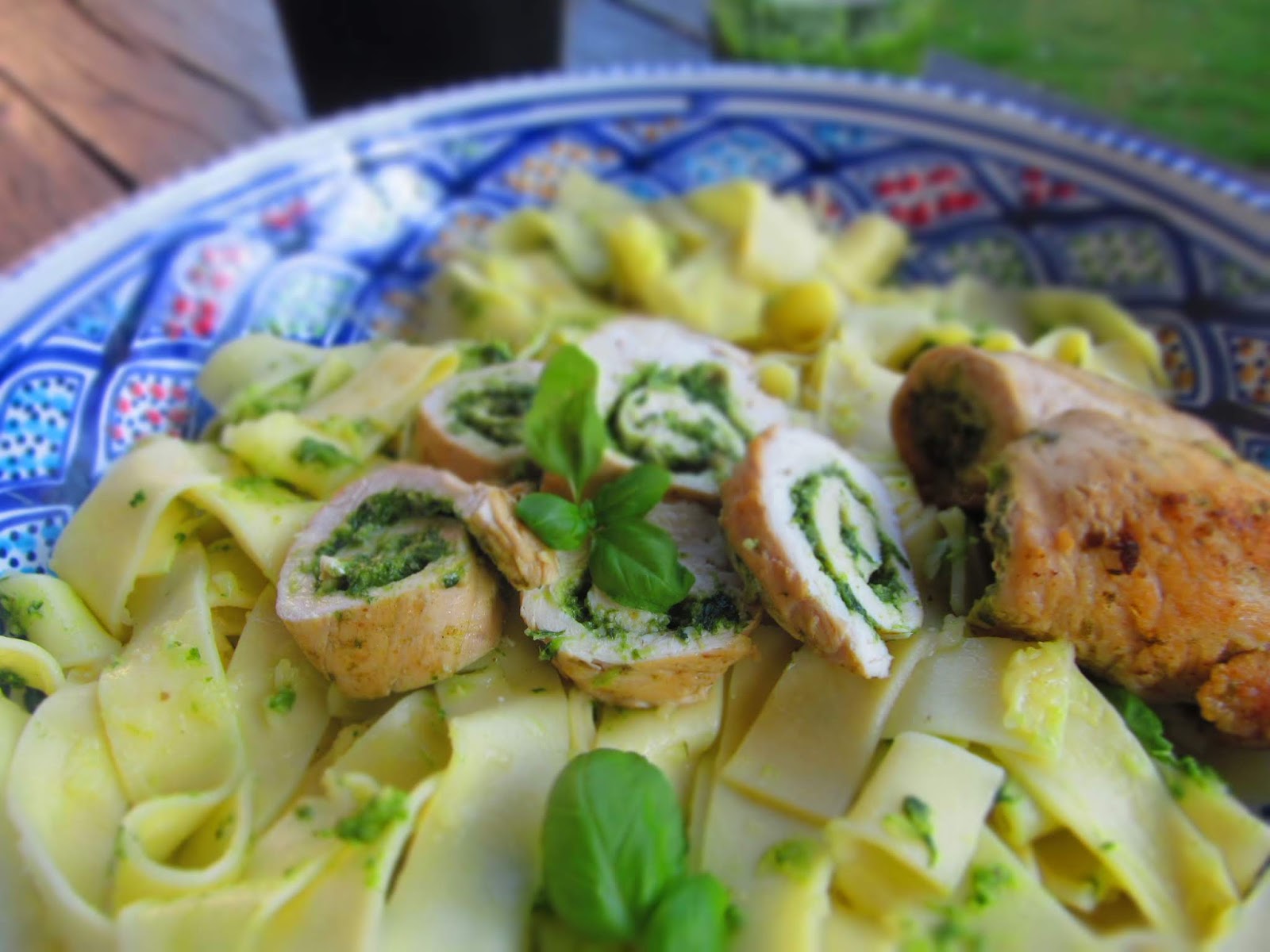 С част от това песто направих пилешки рулца, които сервирах върху широки нудели. Да! Нудели се наричат в Германия всички макаронени изделия /познати така на моето поколение в България/ и известни в Италия като паста.