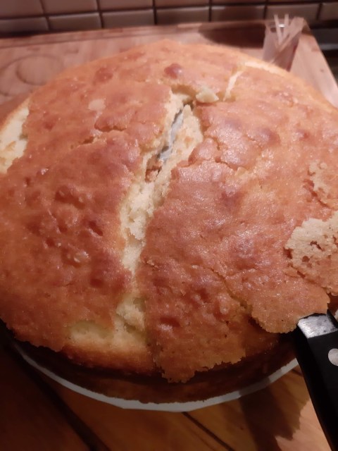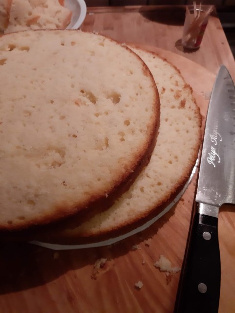 - Както знаете изпекох два блата. Така, след тяхното изравняване /отрязване на капачето/ и правилното им хоризонтално разделяне получих 4 еднакви блата.