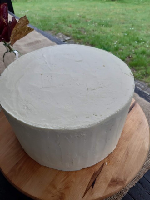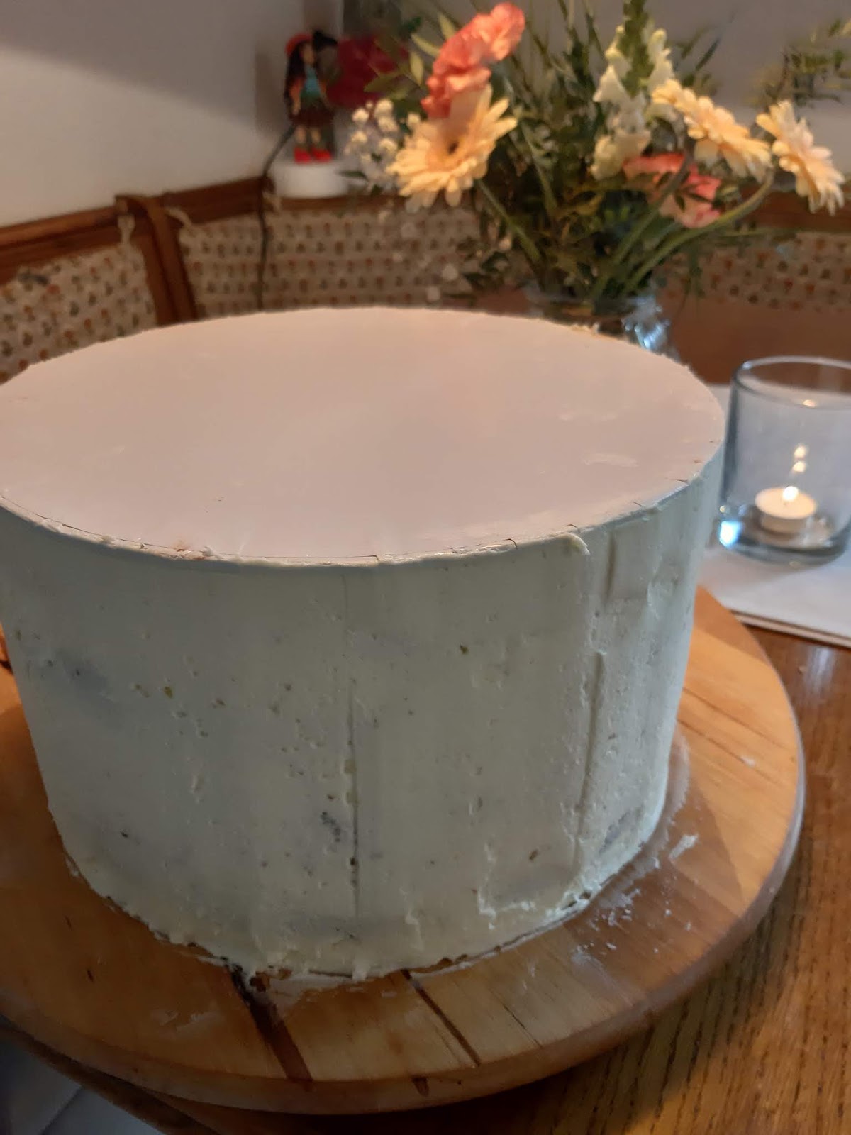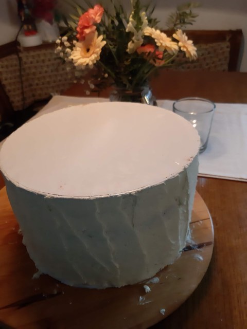 - После слагам голям слой маслен крем отгоре на тортата, изравнявам и покривам с един кейкборд, който е облечен целият с фолио за свежо съхранение.