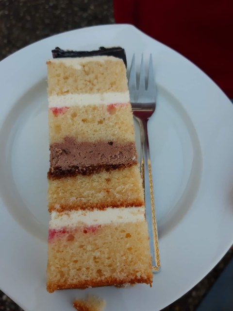 Тортата се прави от пандишпанови блатове, сладкарски крем, алхермес /местен билков ликьор, който е в яркия червен цвят/, кафе, какао и захарно покритие или пък е покрита с разбити белтъци. Ако имам време, ще Ви покажа подробната рецепта в отделна публикация.