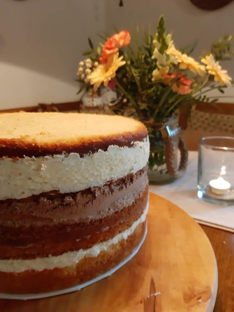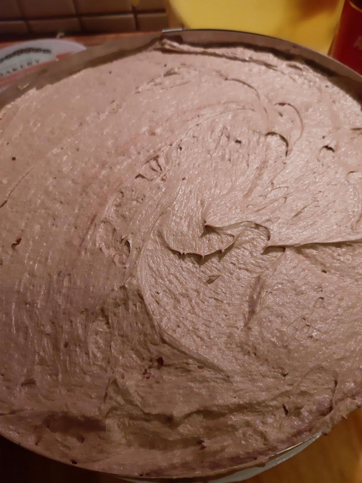 Това е тортата, чието раждане ние всички заедно проследихме. Всичко започна в неделя по време на моето първо включване на живо с видео в групата Обичам да готвя. Тогава се наложи да изтичам и изключа фурната, защото се печеше блатът за тази торта.