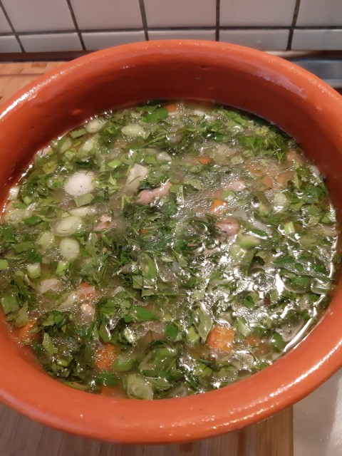 - Добавям сърчицата, заедно със сварените зеленчуци, но извадени с решетъчната лъжица от бульона. Него е нужно да премерим. Нарязвам и един стрък пресен лук за цвят.