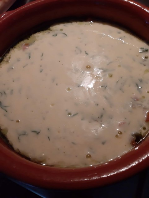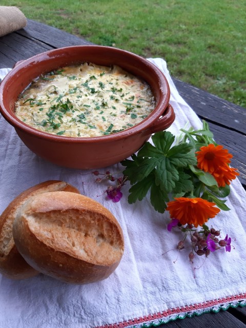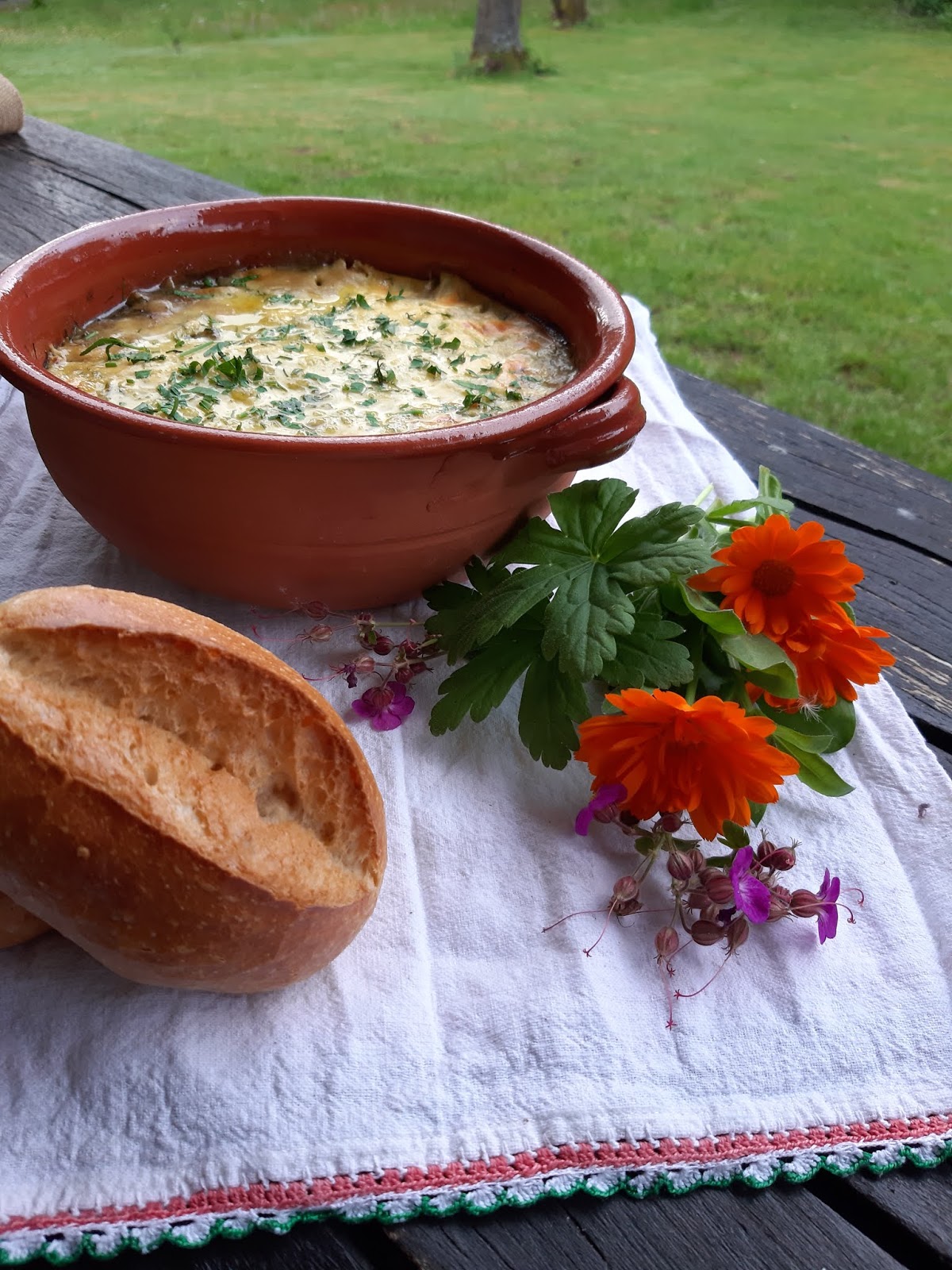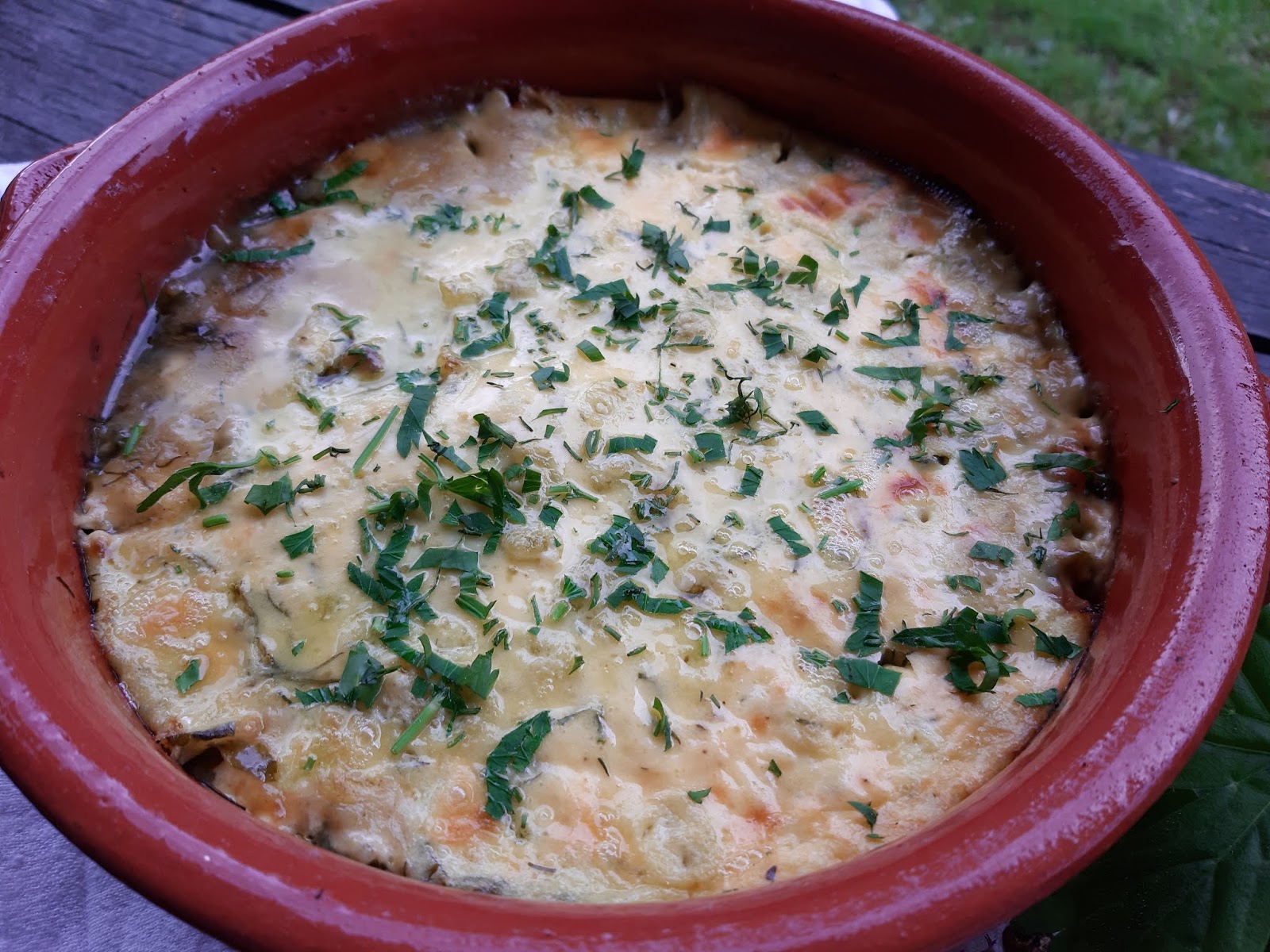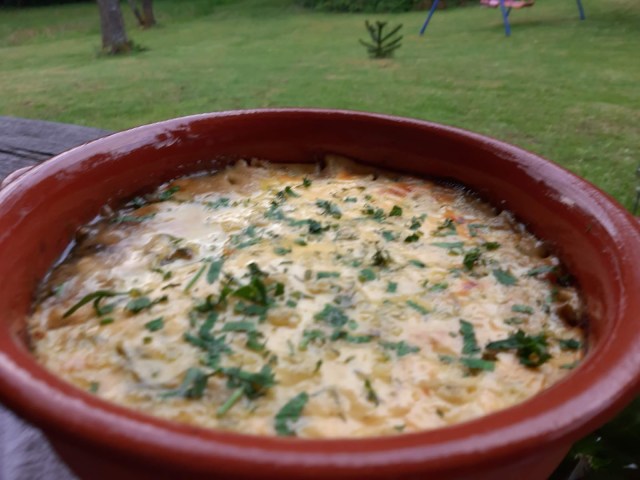 - Залях с яйчената смес и върнах във фурната, но на горно ниво. Близо до реотаните. Така за 10 минути заливката доби златист цвят.