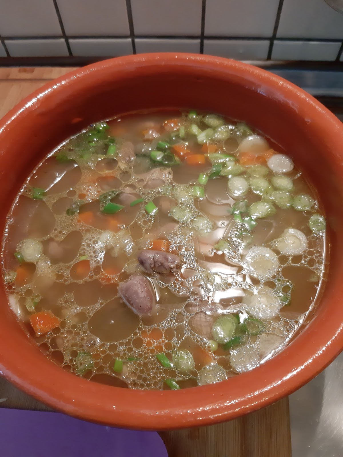 - Измитите сърца, обеления и нарязан на малки кубчета морков, нарязания на кубчета кромид лук, както и нарязаната целина слагам в тенджерата. Покривам с бульон и сварявам до пълна готовност.