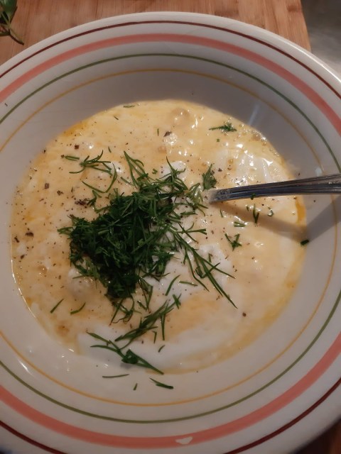 - През това време разбих яйцата с брашното и киселото мляко. Подправих с черен пипер и зелени подправки.