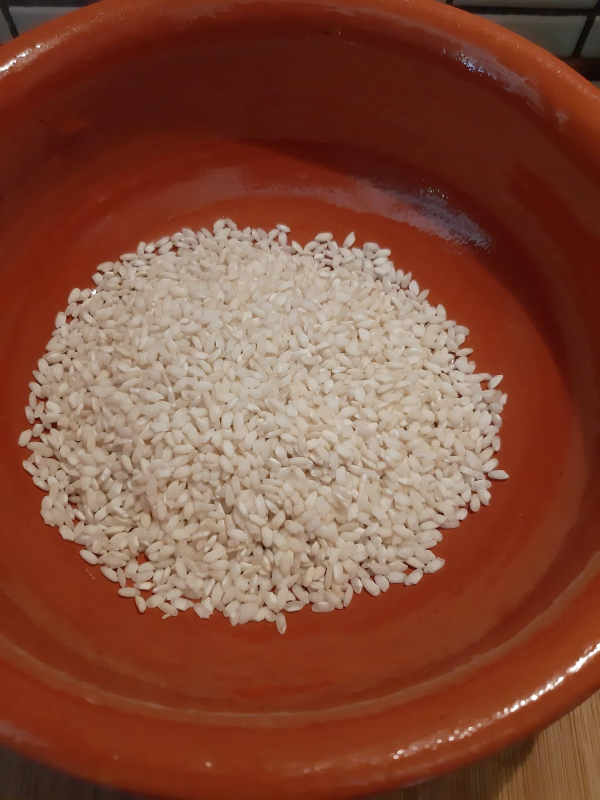 200 гр ориз /моят е Arborio от Италия, защото бяхме скоро там на почивка, но препоръчвам български кръгъл ориз или Milchreis в Германия/