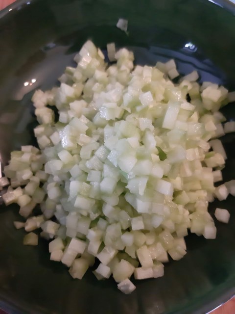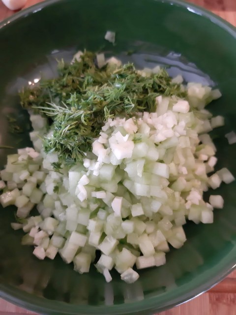 - Лукът нарязвам също на тънки колелца, а краставицата на много малки кубчета.