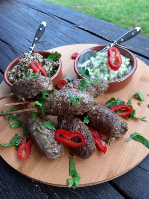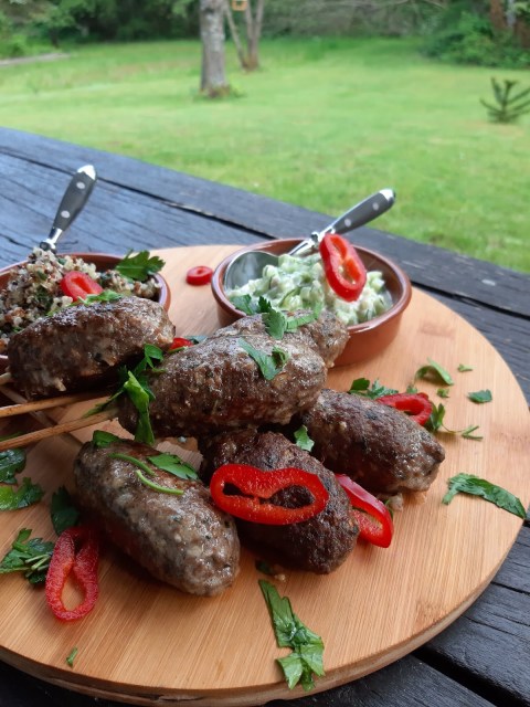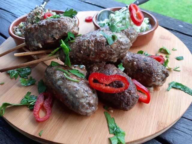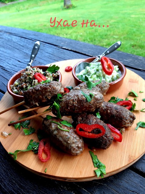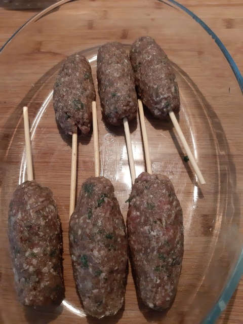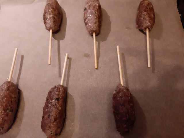 - Омесвам като за кюфтета и оформям на рулца, които нанизвам на дървените шишчета.
