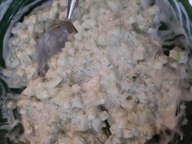 - Всичко обърквам с киселото мляко и подправям със сол и черен пипер. На вкус може и малко олио да се добави.