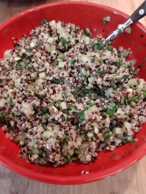 - През това време приготвям киноата. За целта поглеждам на опаковката какво съотношение е дадено за вода – киноа.