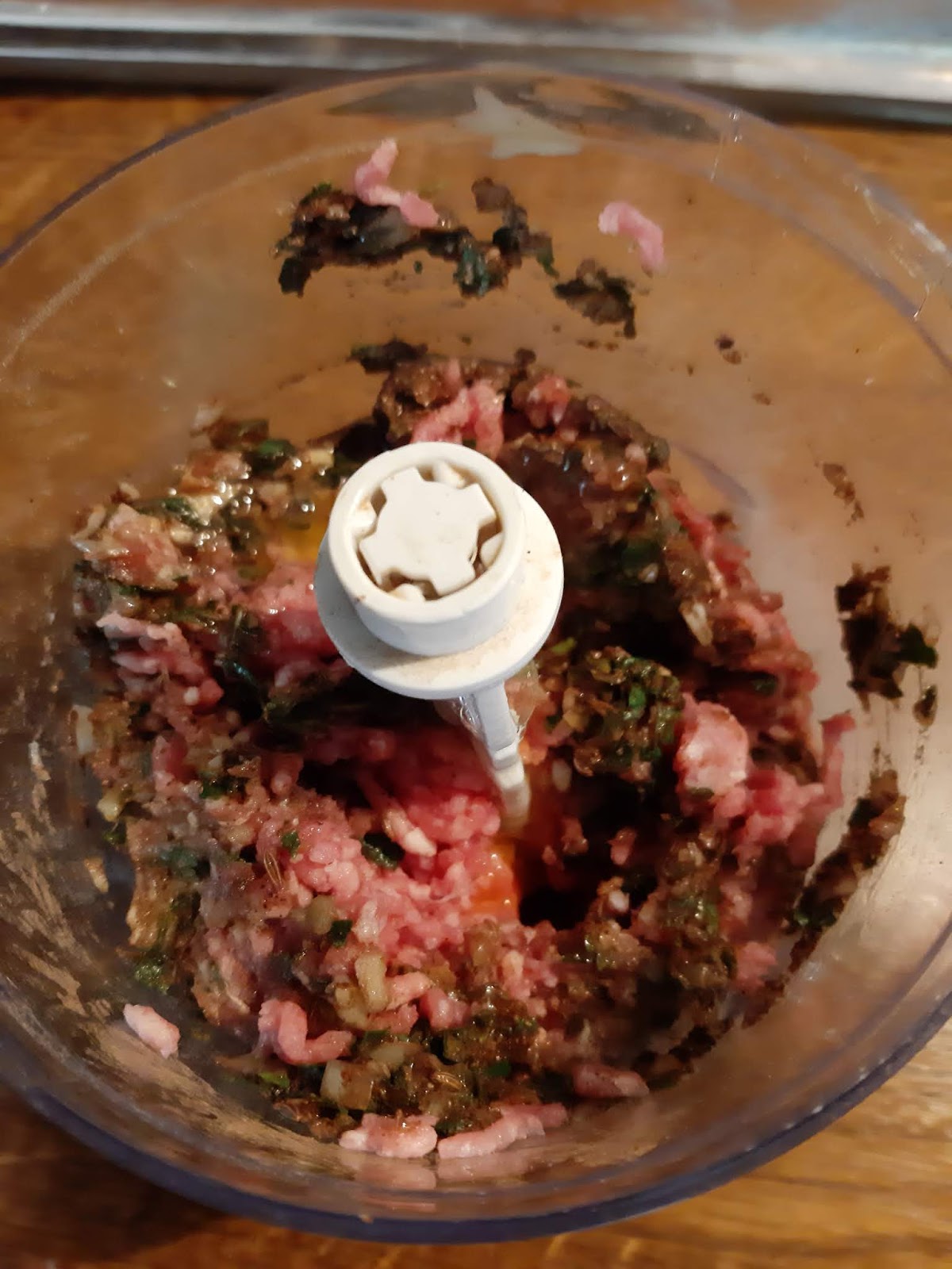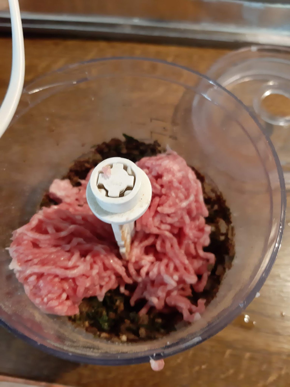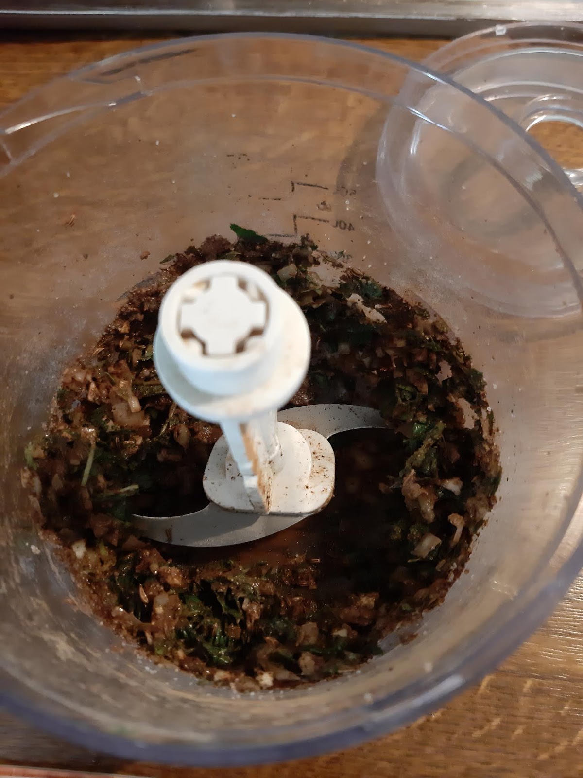 - Нарязания на кубчета лук, скилидките чесън, нарязаният на едро джоджен слагам в блендера и заедно с кимиона, канелата, черния пипер и солта смилам.
