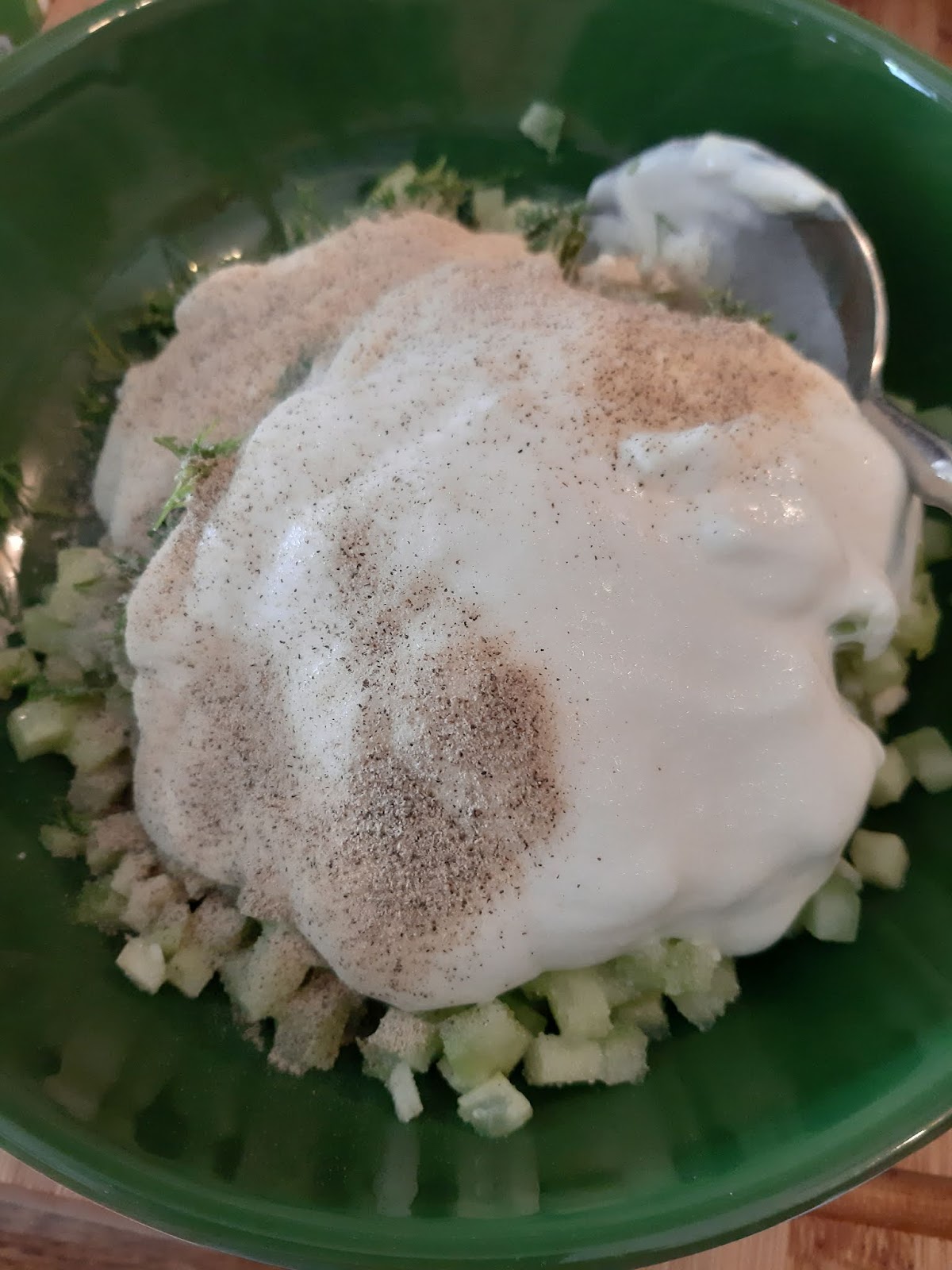 - За сухия таратор нарязвам краставицата на малки кубчета. Ако няма веднага да сервирам, изтисквам водата от краставиците. Или пък просто премахвам семената, но още преди да съм нарязала краставицата на кубчета.