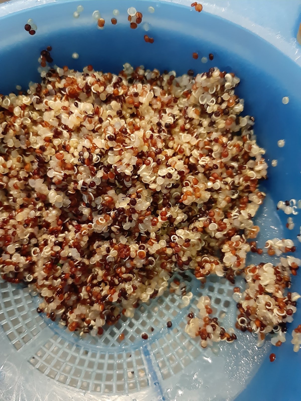 - През това време приготвям киноата. За целта поглеждам на опаковката какво съотношение е дадено за вода – киноа.