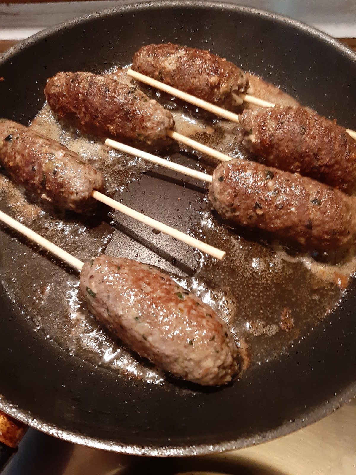 - Омесвам като за кюфтета и оформям на рулца, които нанизвам на дървените шишчета.