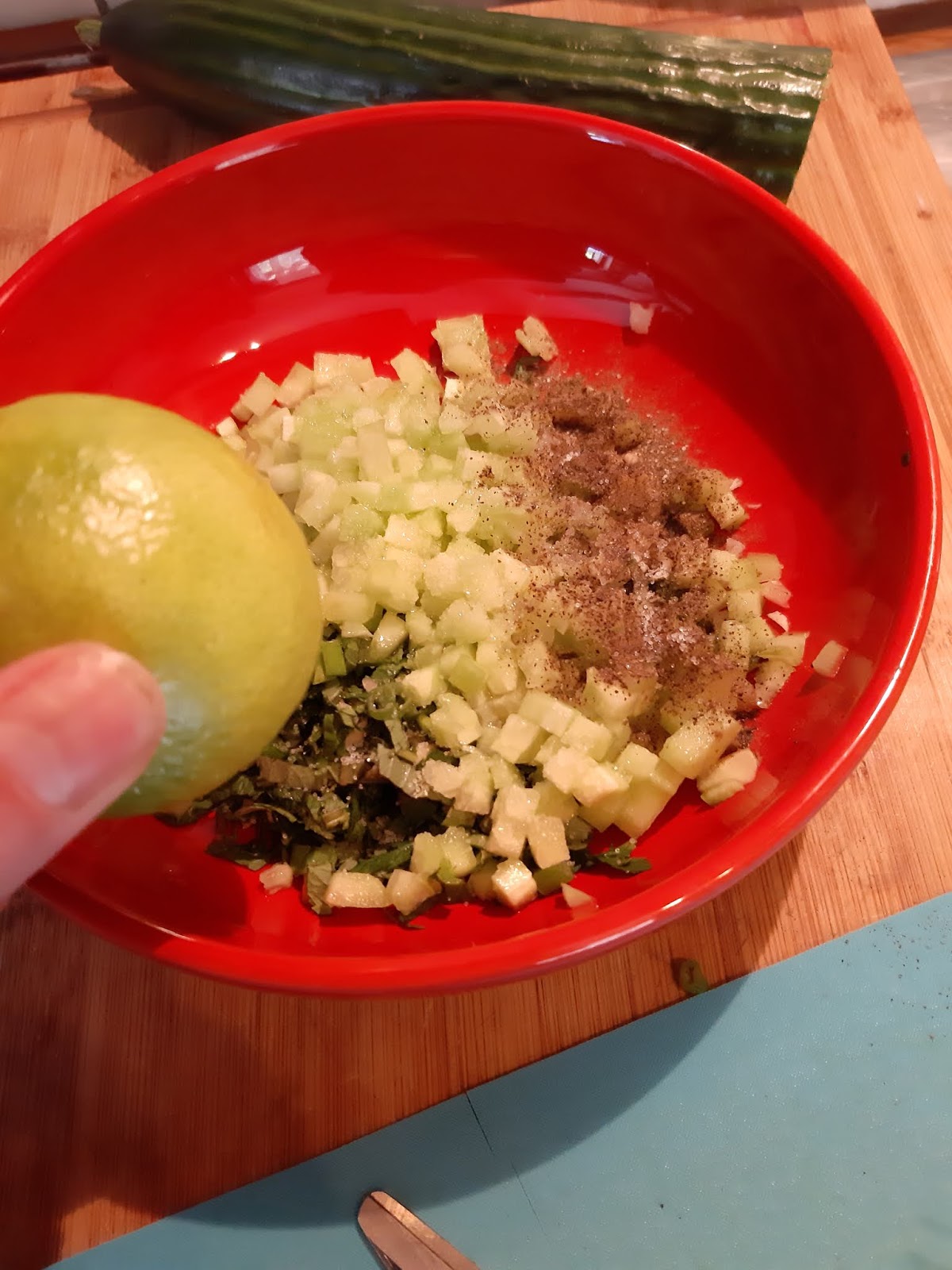 - Смесвам всичко и поръсвам със зехтина и сока от зеленото лимонче.