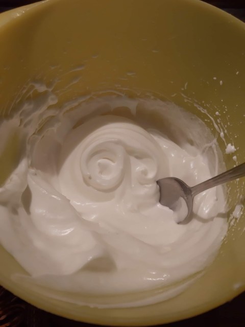 • През това време разбивам белтъците на сняг, като добавям малко по малко от пудрата захар.