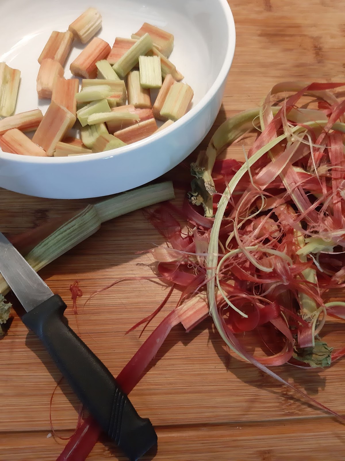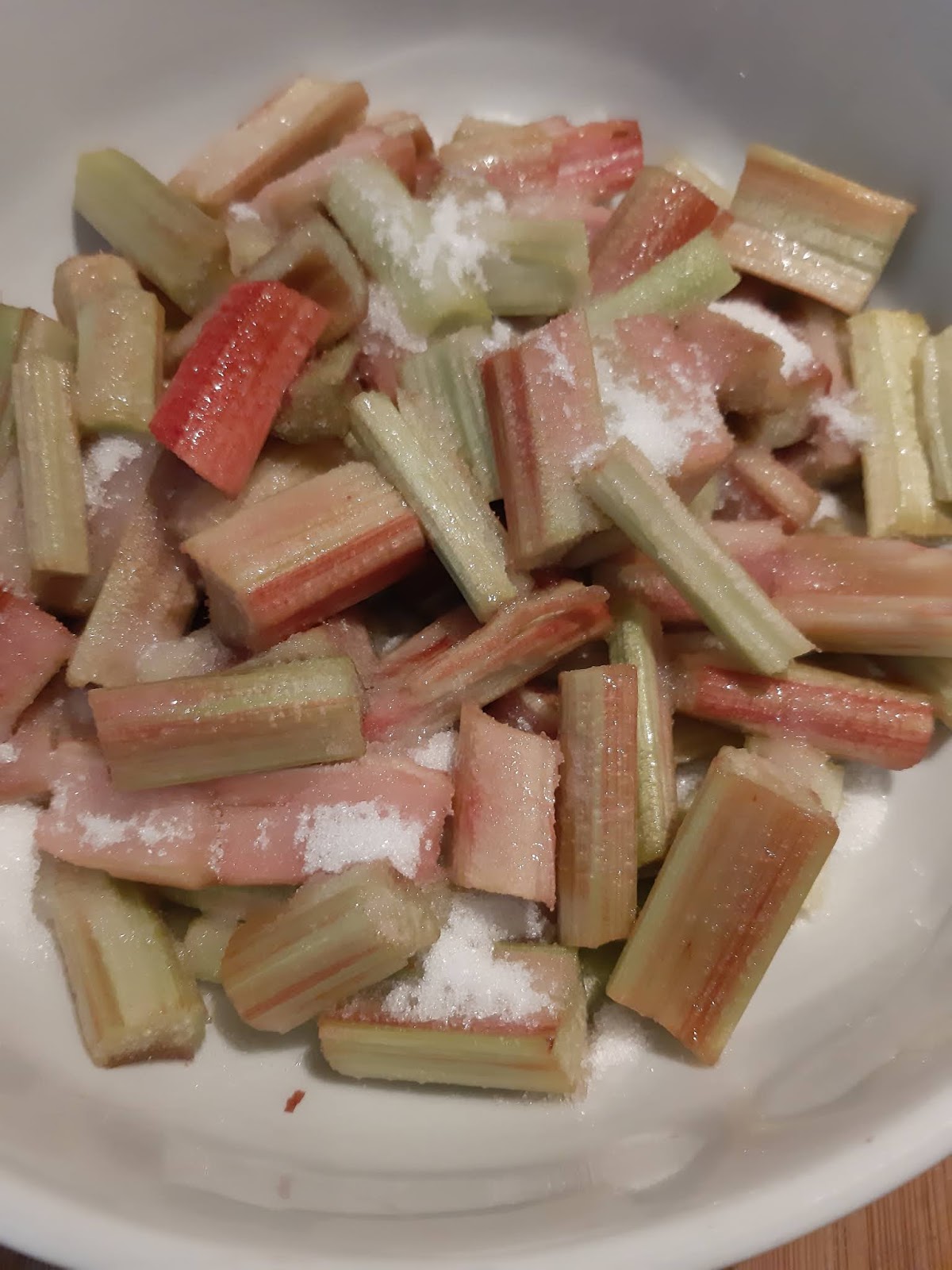 • Обелвам ревена и нарязвам на парчета с размер около 3 см. Поръсвам със захарта