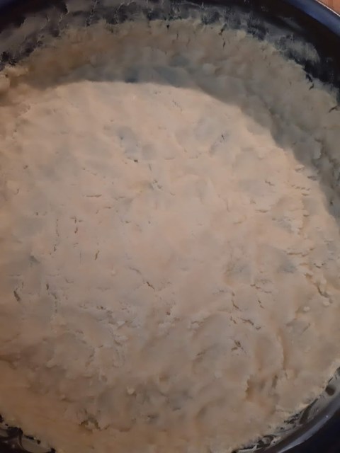 • Омесвам до меко тесто. Ако тестото Ви е на трохи добавете един жълтък. Ако остава да си е твърдо и на трохи, добавете и втория жълтък. И така, докато получите меко тесто, което да разстелете на дъното на формата и малко по стените.