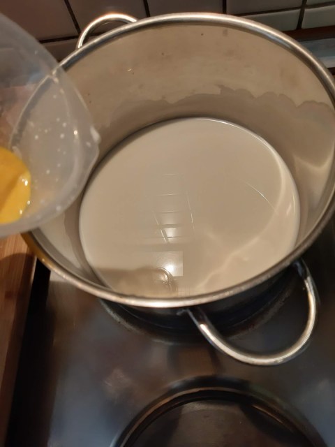 • Сварявам 300 мл мляко с разтвореното пакетче ванилов пудинг, както е описано на опаковката.
