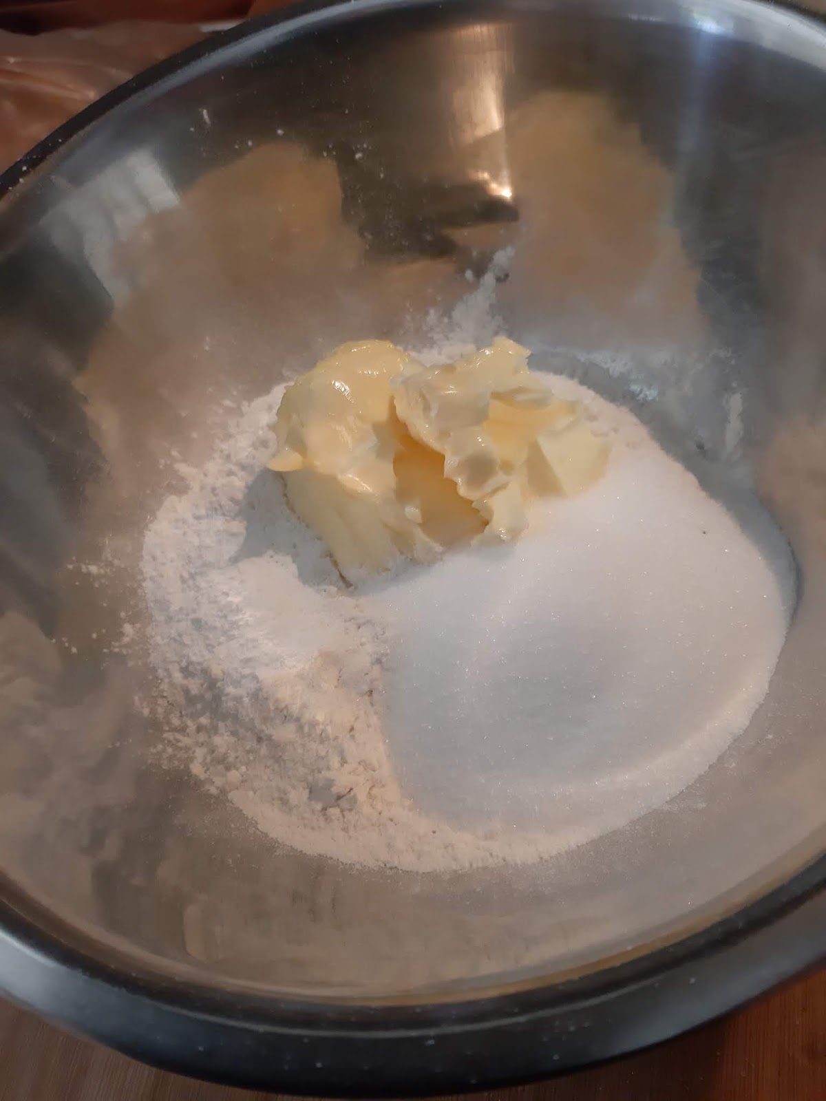 • В купа си измервам брашното, захарта, бакпулвера и маслото.