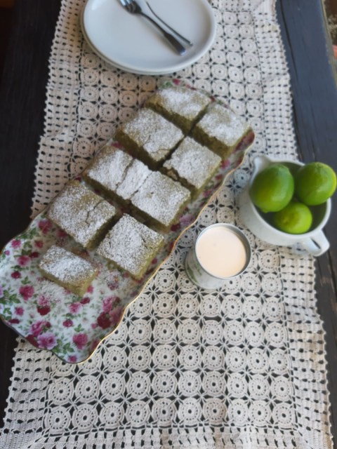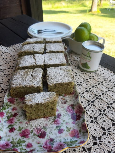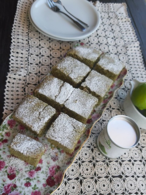 - Зеленият охладен кекс нарязвам на квадратчета и поръсвам с пудра захар.