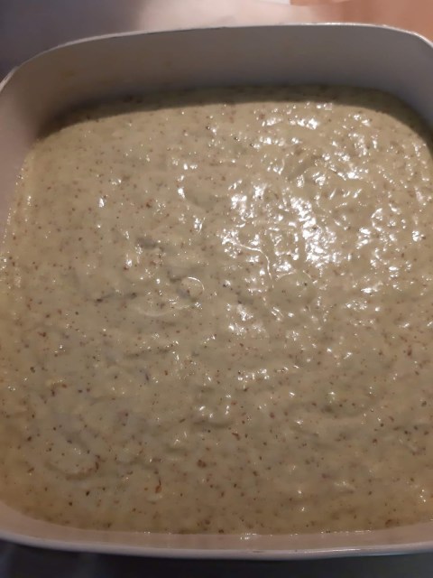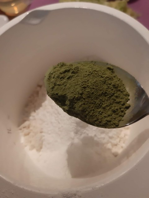 - В друга купа смесвам сухите съставки – брашно, бакпулвер, бадеми и матча.