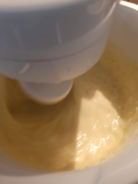 - В купата на миксера чуквам яйцата, добавям солта и отмервам захарта.