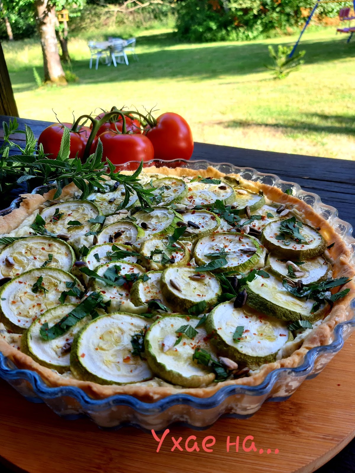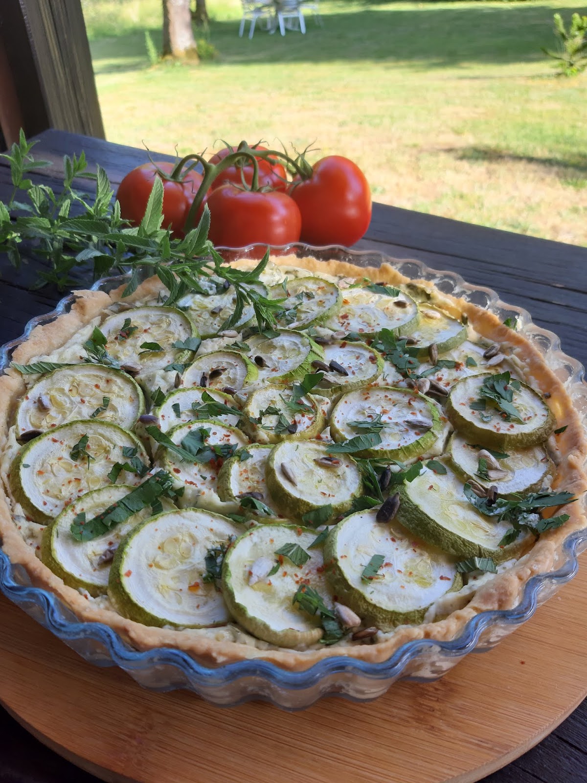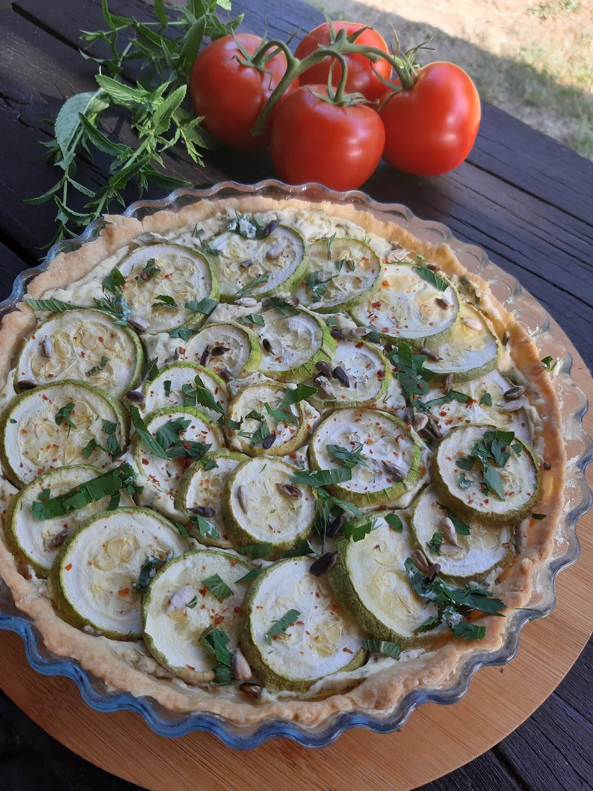 А пък в случая пресните тиквички са в съчетание с един билков крем от крема сирене и за хрупкав финал поръсих с печено слънчогледово белено семе. Вкусна е тази тарта и топла, и студена. Подходяща за големите жеги в момента.