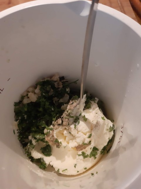 • През това време приготвям крема, като смесвам крема сиренето със ситно нарязания магданоз и ситно нарязания чесън. Овкусявам със сол и черен пипер. Добавям и сокът на лимона и настърганата му кора.
