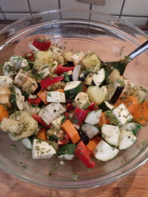 - Всички зеленчуци нарязах на горе – долу еднакви по големина кубчета и смесих в купа.