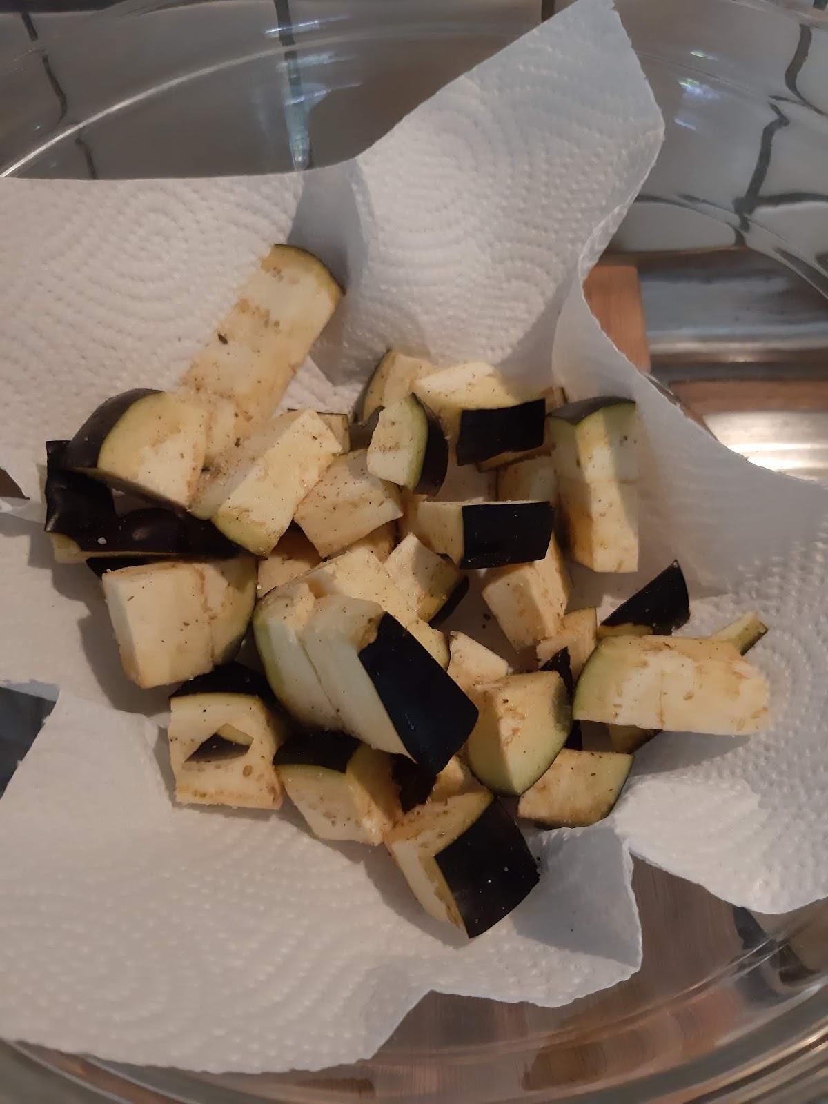 - Нарязах патладжаните на малки кубчета, поставих в куха и върху домакинска хартия и посолих обилно. Оставих ги за около 15 минути да си пуснат горчилката.