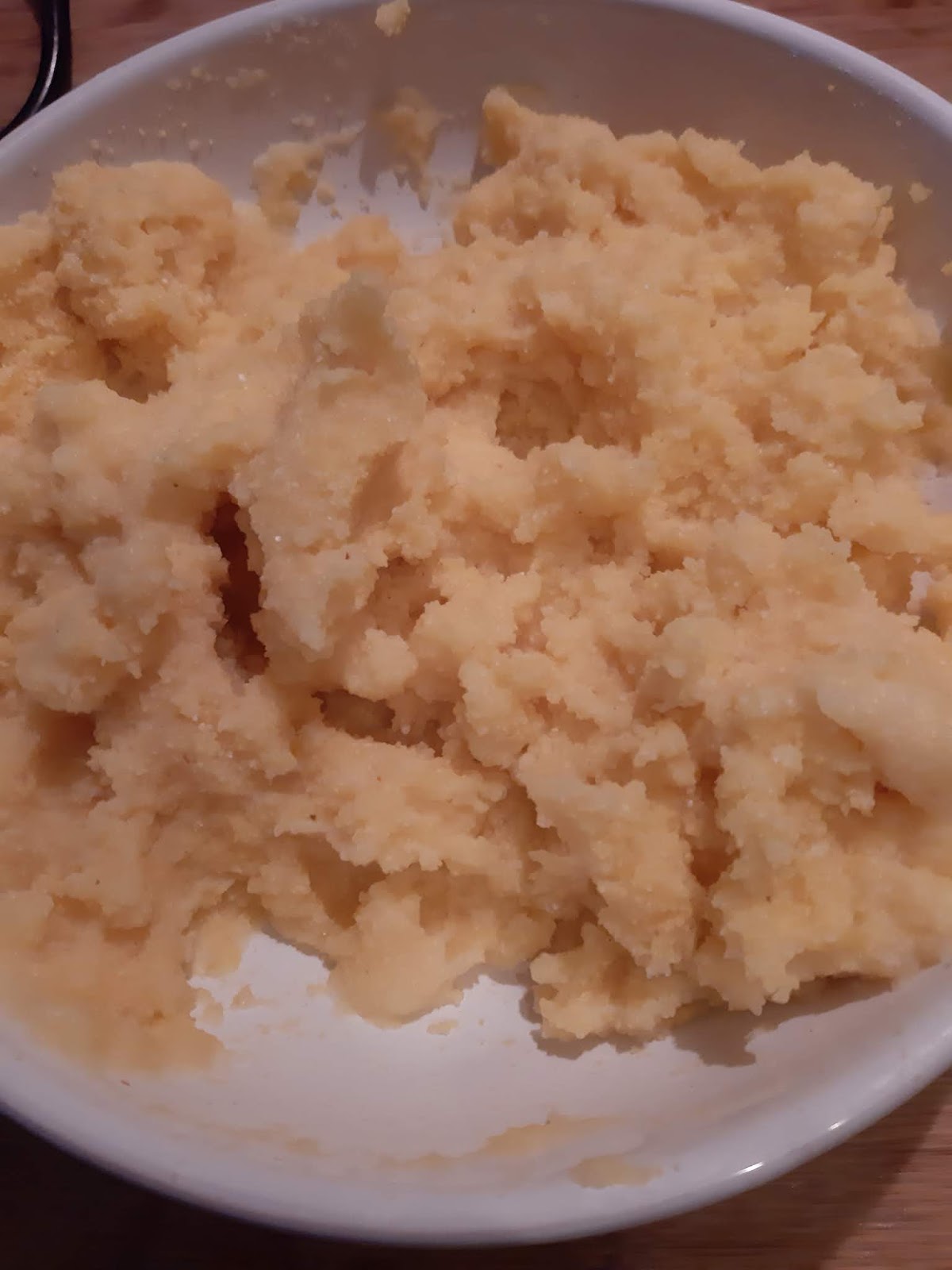 - В купа смесвам полентата със солта и заливам с врящата вода. Разбърквам и оставям да се охлади.