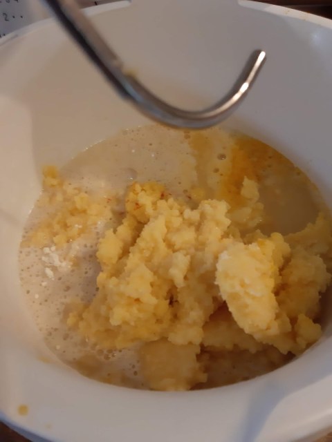 - Шафранът накиснах с малко водичка, за да си пусне цвета. Той се добавя само, ако искате по-жълт цвят. Не е задължителен.