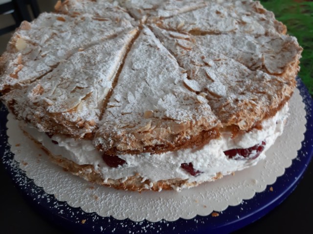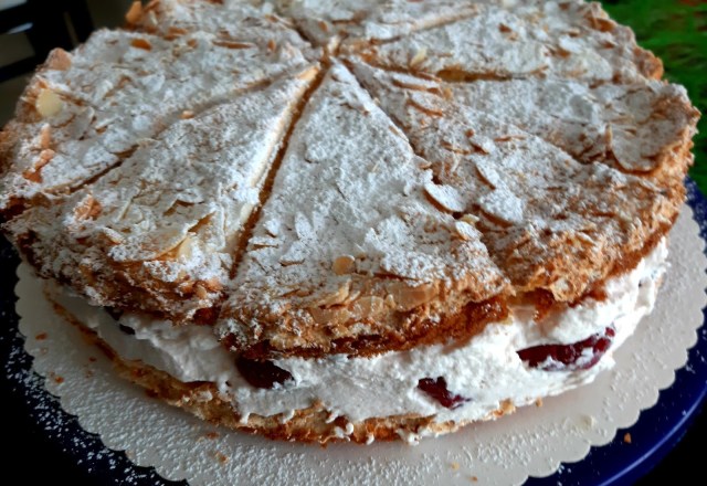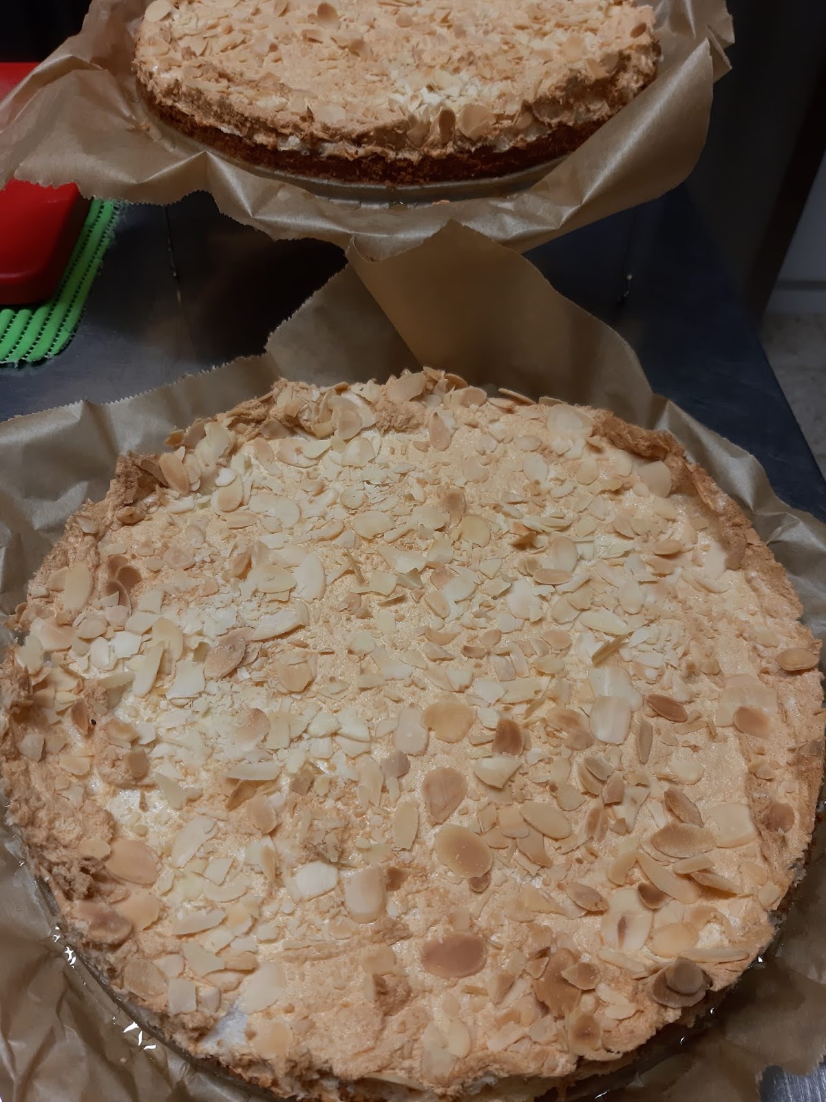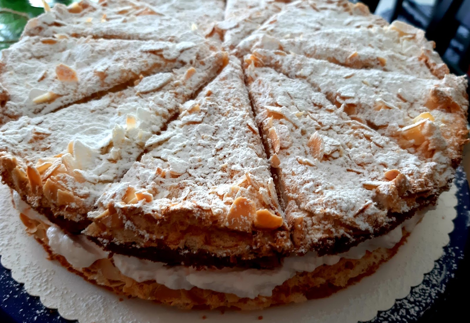 Важното за тази торта е да се приготвят два отделни блата с белтъчно хрупкаво капаче, покрито обилно с бадемови люспи. Ама повече подробности можете да прочетете в рецептата!
