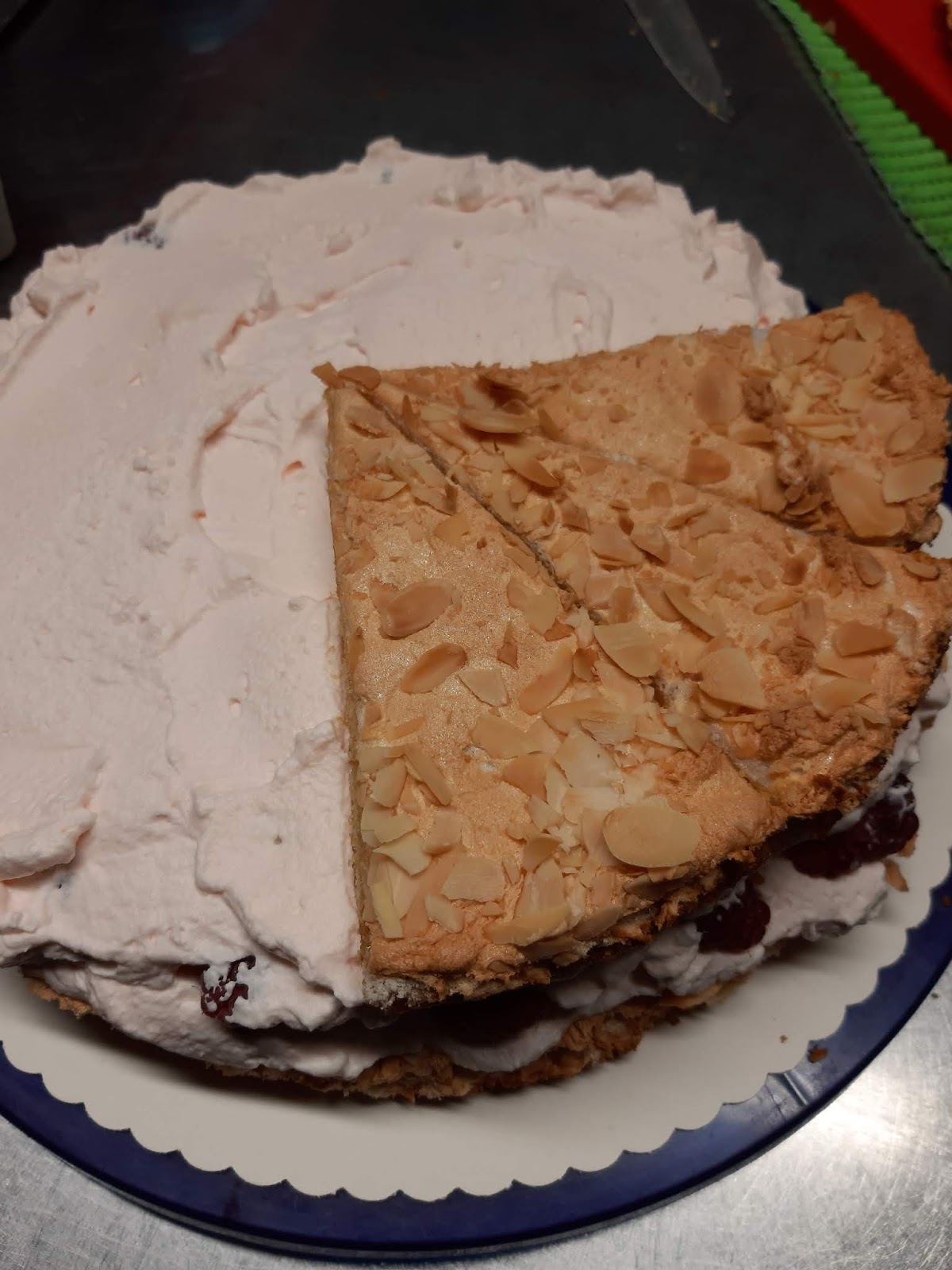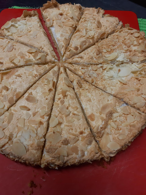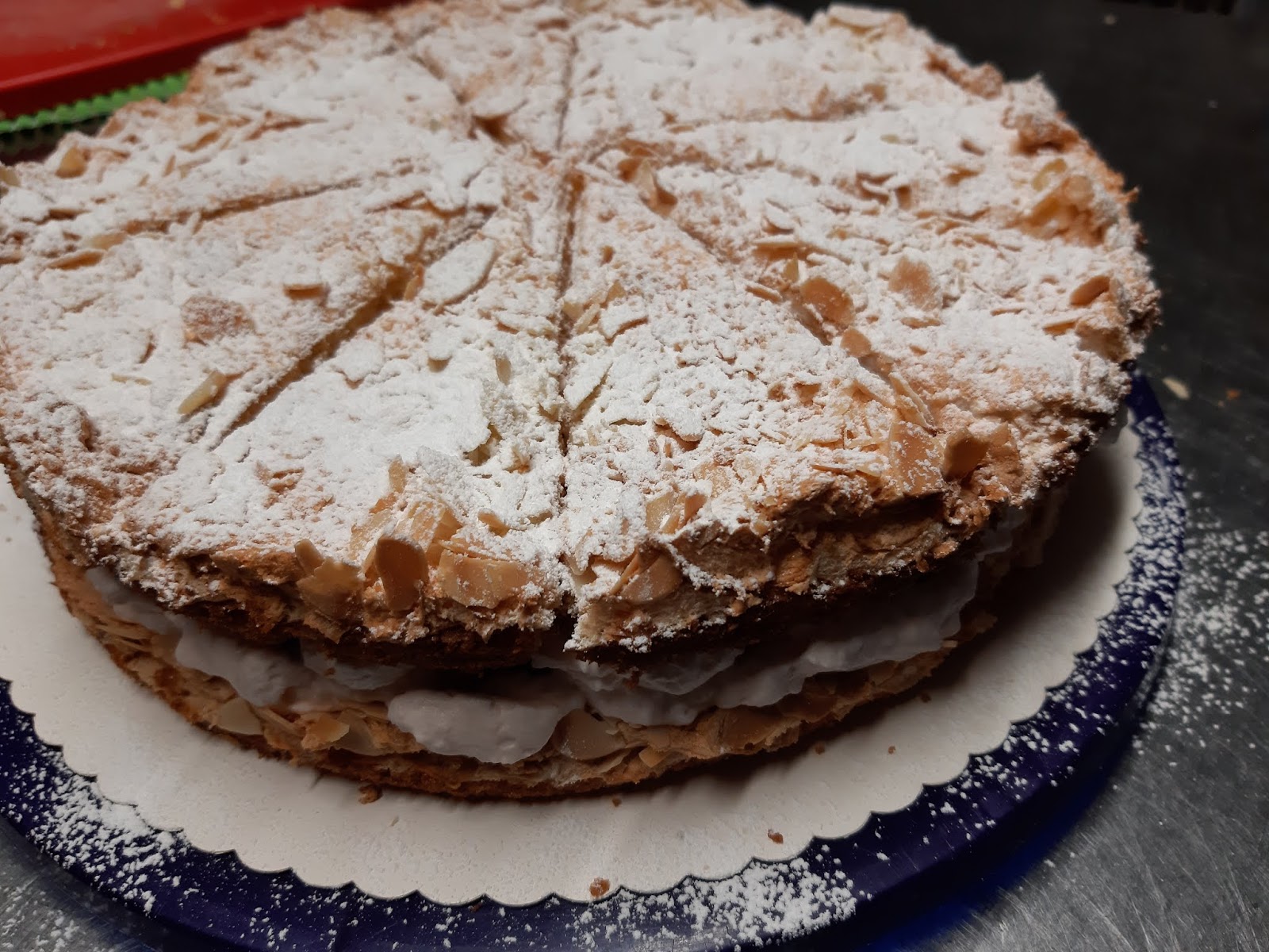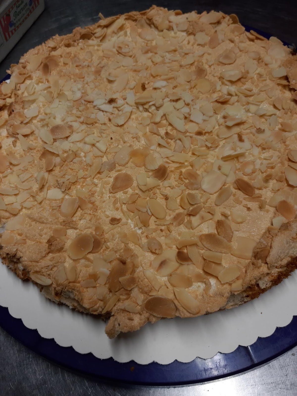 Важното за тази торта е да се приготвят два отделни блата с белтъчно хрупкаво капаче, покрито обилно с бадемови люспи. Ама повече подробности можете да прочетете в рецептата!