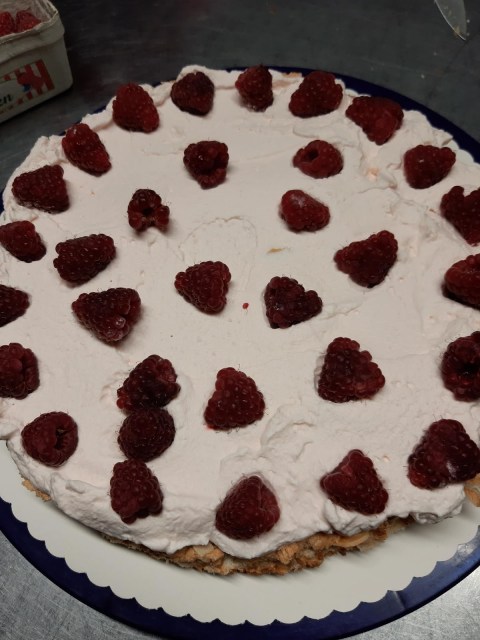- С половината от сметаната намазвам първия блат и подреждам малините.